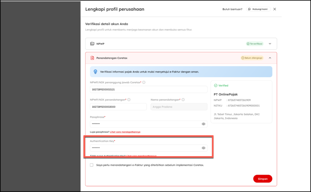 Kunci ini berfungsi sebagai verifikasi keamanan, sehingga OnlinePajak dapat: