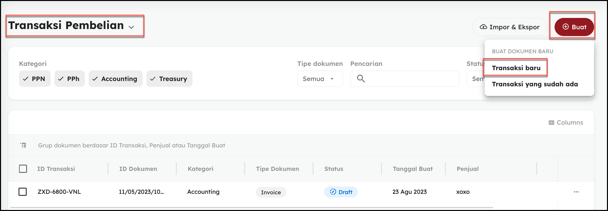 - Pastikan Anda berada pada tab Faktur Komersial. (Pada Header Klik Menu Penjualan – Semua transaksi Penjualan / Pembelian ) Klik Tombol Buat – Transaksi Baru