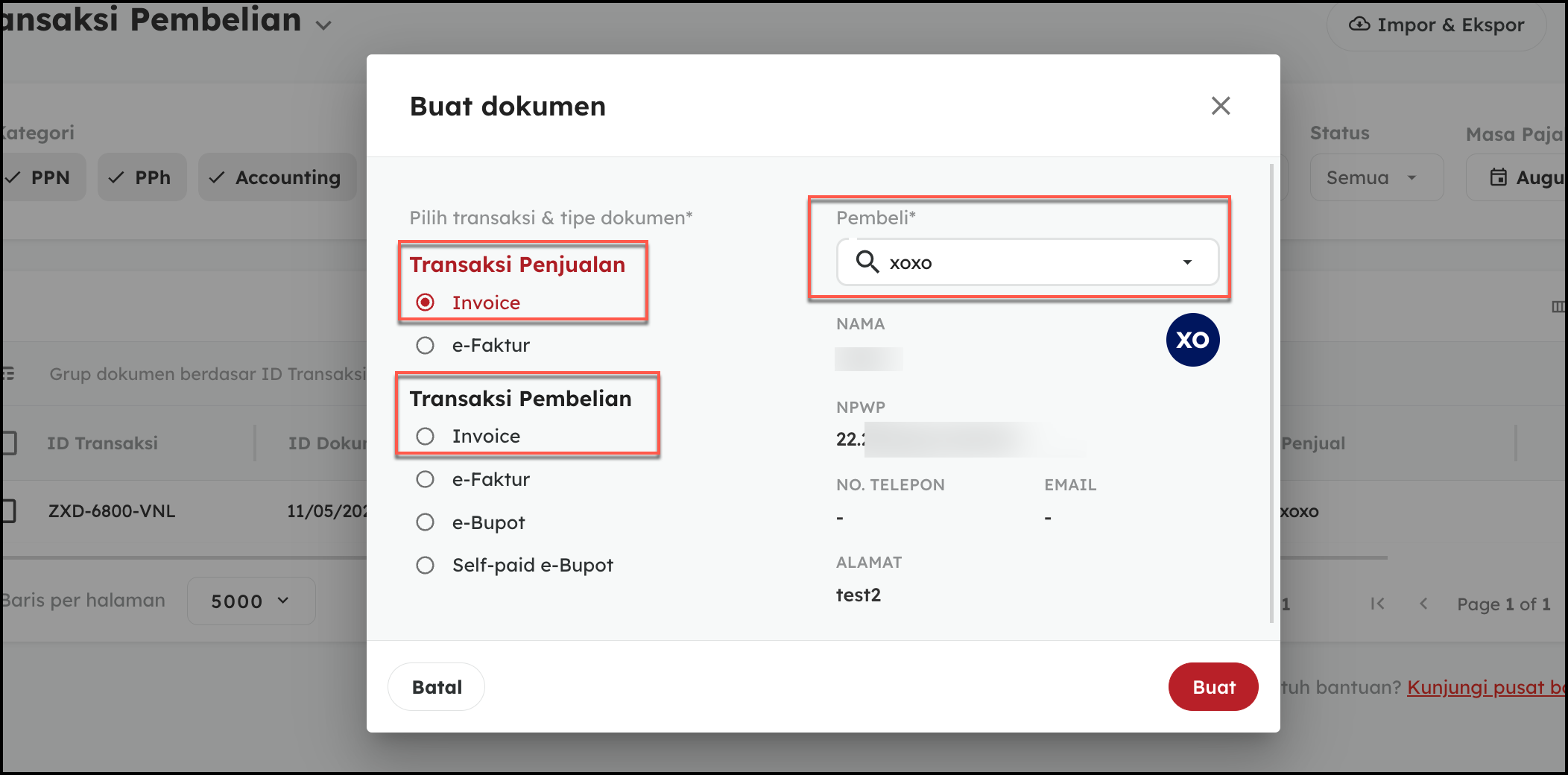 - Pilih Invoice (Penjualan/Pembelian). Lengkapi nama lawan transaksi. Kemudian klik kembali tombol Buat,