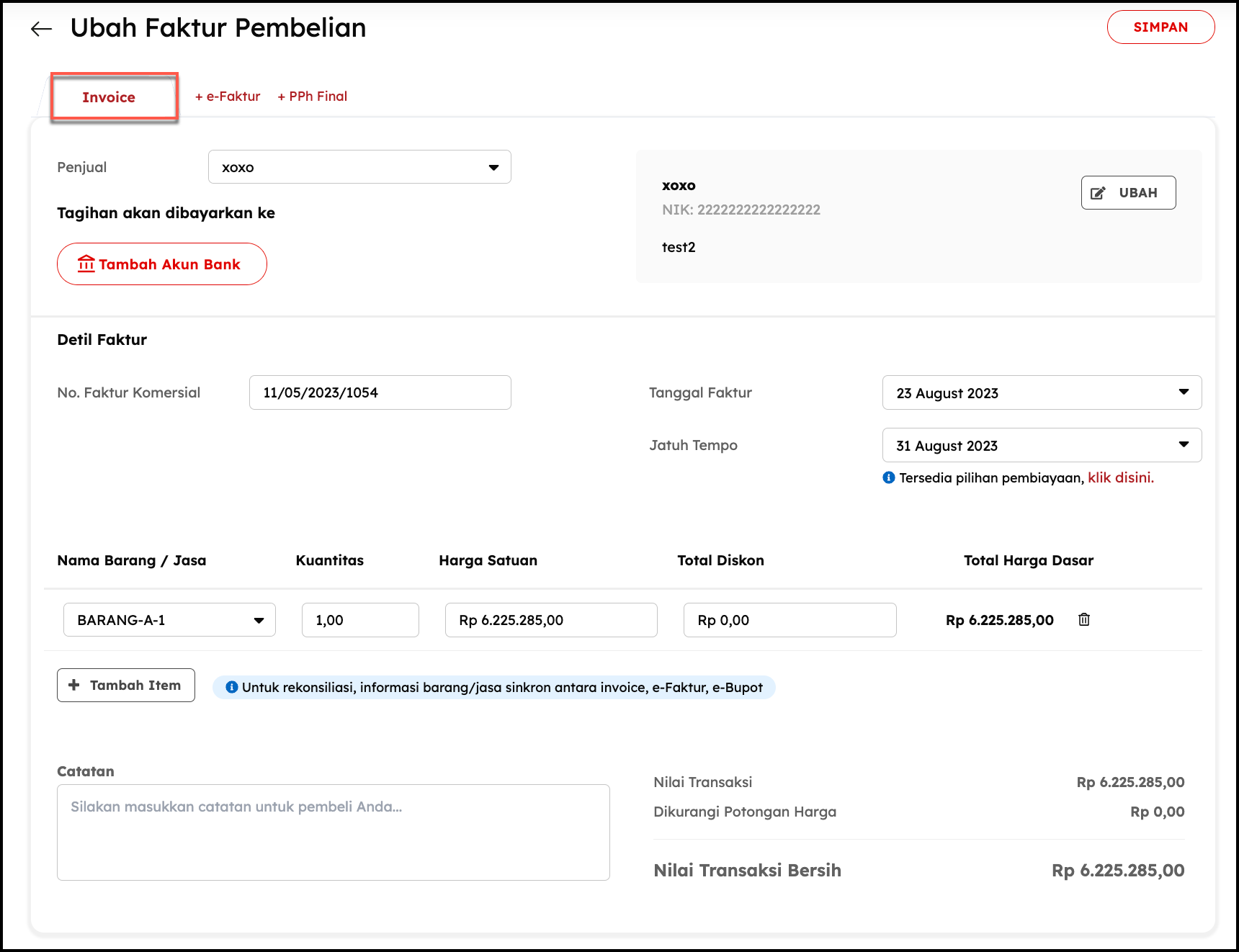 - Jika data yang diiput sudah sesuai, Silakan klik tombol Simpan Invoice untuk menyimpan Draft transaksi. Ketika transaksi sudah di simpan, Anda akan dialihkan ke halaman list transaksi penjualan.