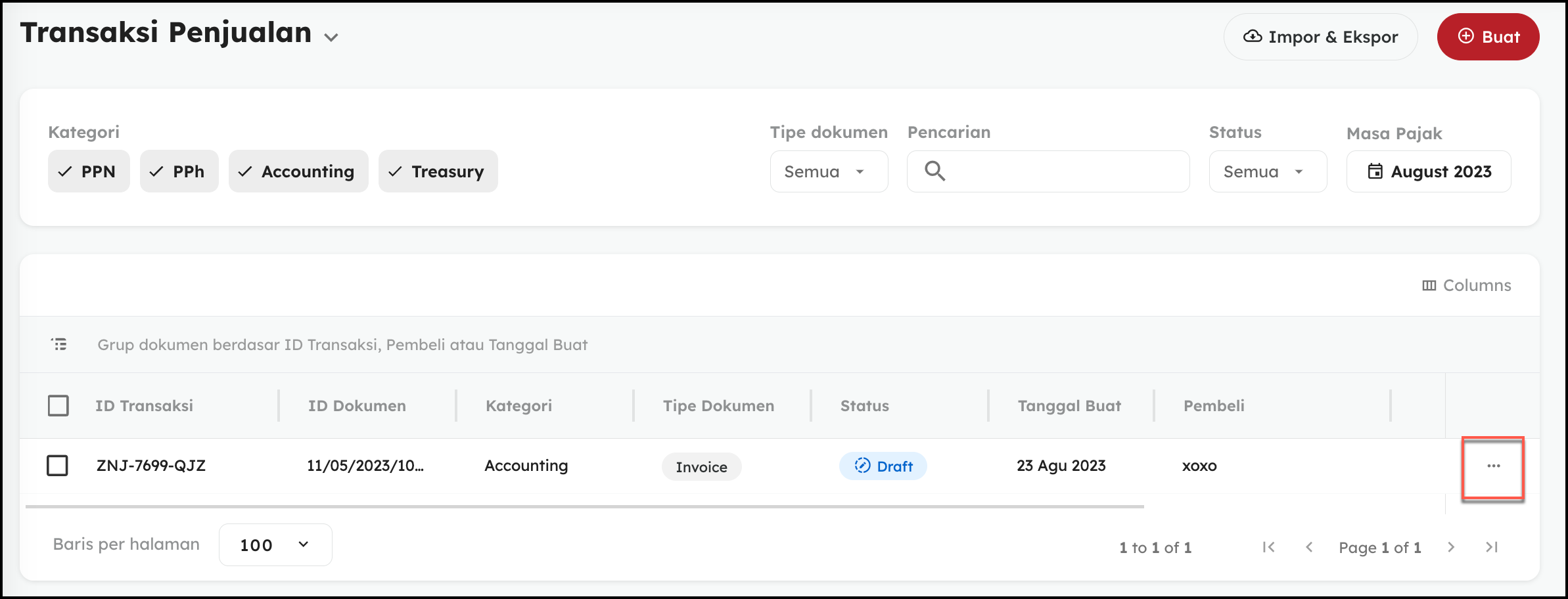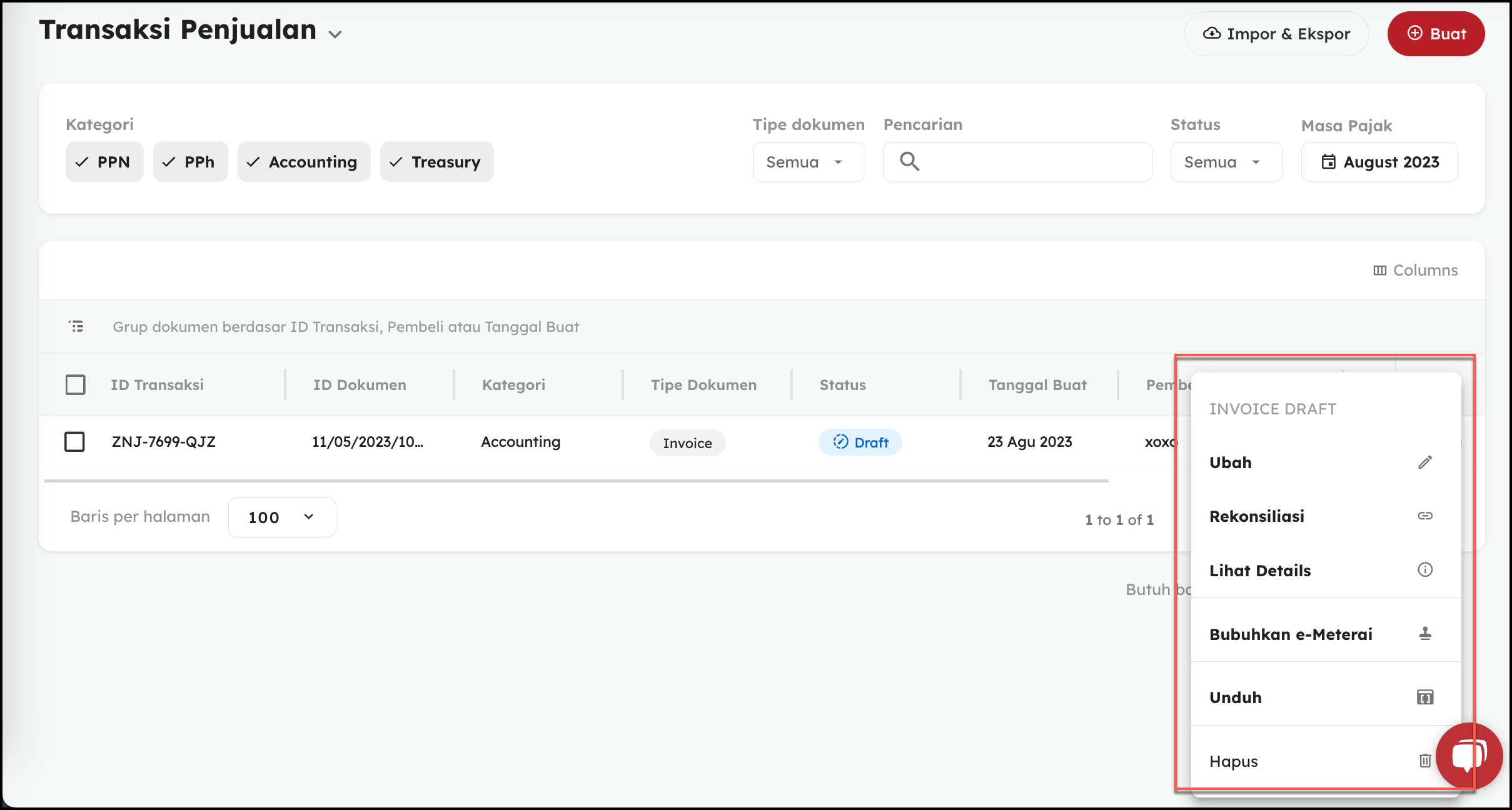 - Transaksi yang berstatus Draft tersebut dapat Anda Ubah/Hapus/Unduh dengan cara mengklik titik tiga pada sebelah kanan transaksi
