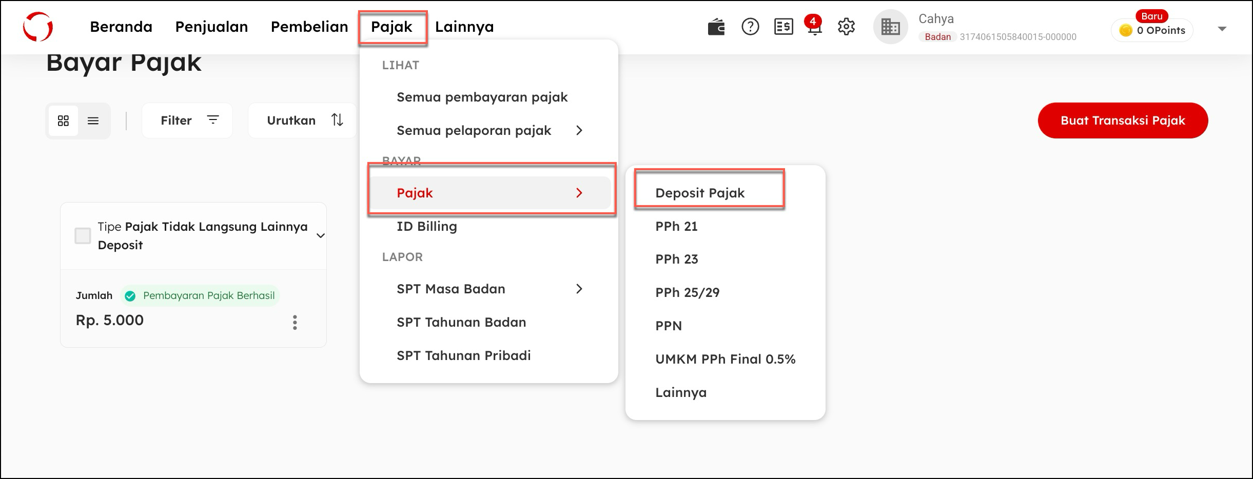 Pada halaman Pajak, pilih submenu Bayar Pajak, lalu lanjutkan dengan memilih Deposit Pajak.