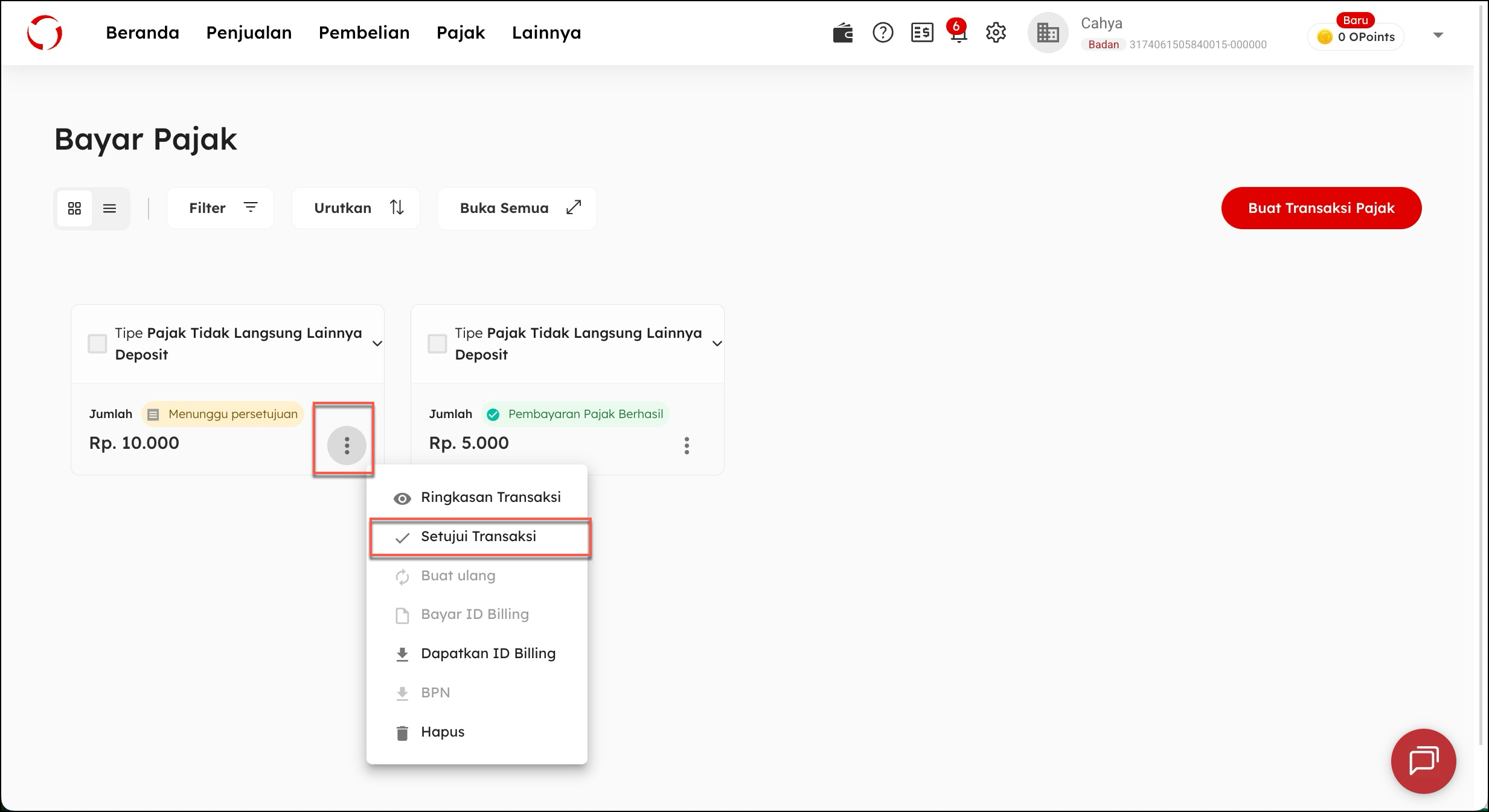 Pada status Menunggu Persetujuan, klik ikon titik tiga di samping transaksi tersebut, lalu pilih Setujui Transaksi.
