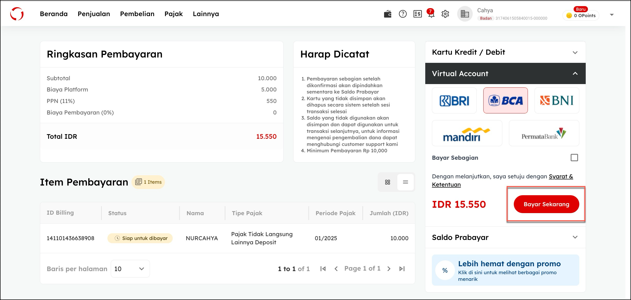 Status akan berubah menjadi Menunggu Pembayaran. Klik tombol Bayar Sekarang.