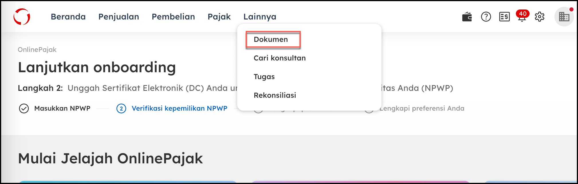 - Pada halaman utama OnlinePajak Buka Tab Menu Lainnya – Dokumen