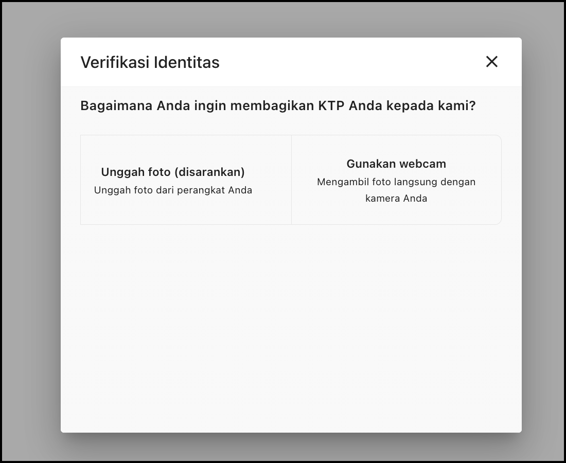 Jika memilih “Unggah foto”. Klik tambahkan foto pada nomor (1), pilih foto yang ada di folder Anda. Kemudian centang ketentuan legal pada nomor (2), Lalu klik “Unggah KTP”