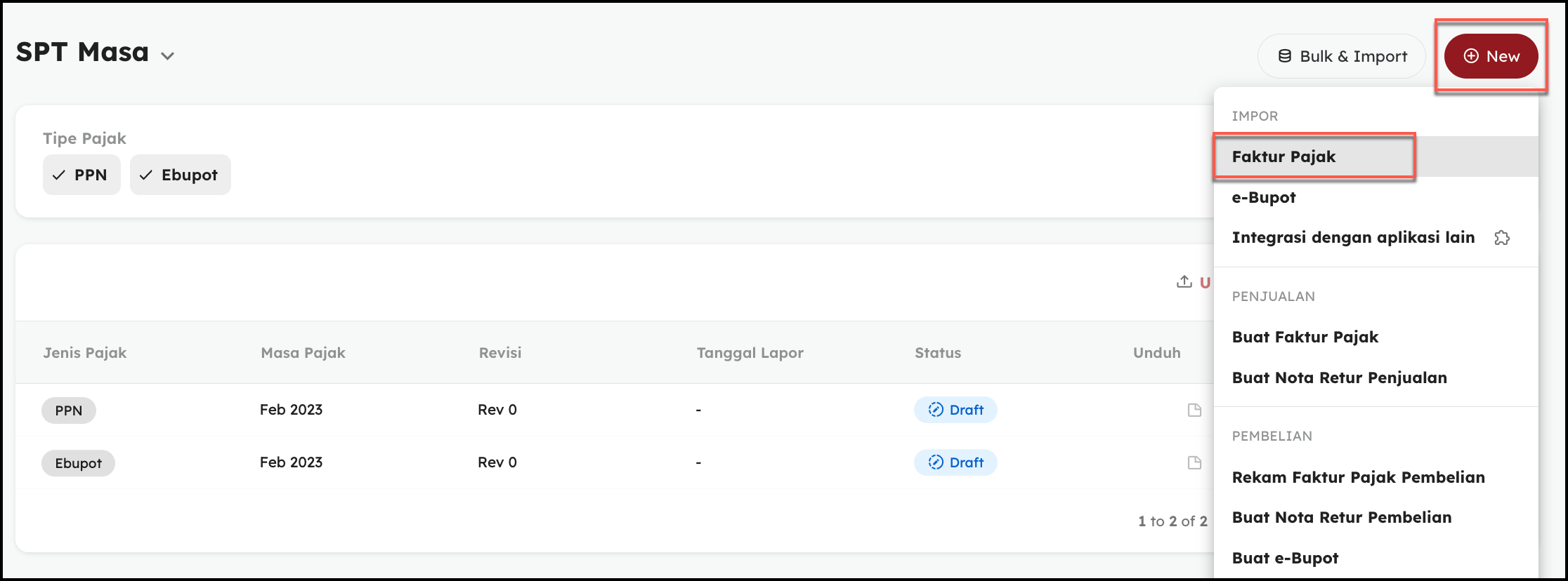 - Klik +New, kemudian klik Faktur Pajak,