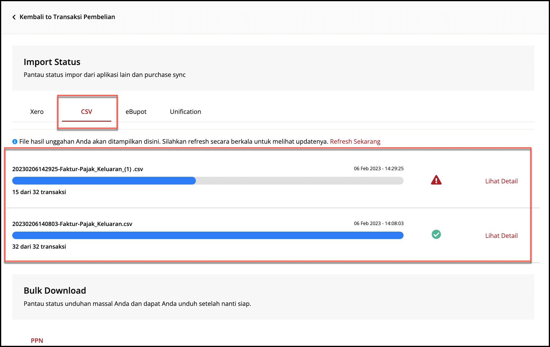 - Setelah berhasil terunggah, Anda akan diarahkan ke halaman Import Status. Klik bagian CSV untuk mengetahui status tersebut