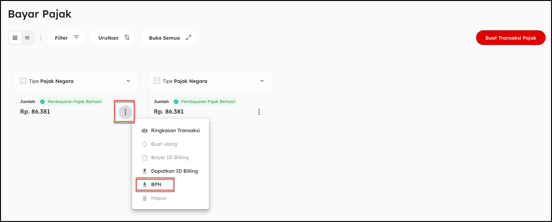 Untuk mengunduh Bukti Penerimaan Negara (BPN), klik filter Terbayar, lalu pilih ikon tiga titik di sebelah kanan, dan klik Download BPN.