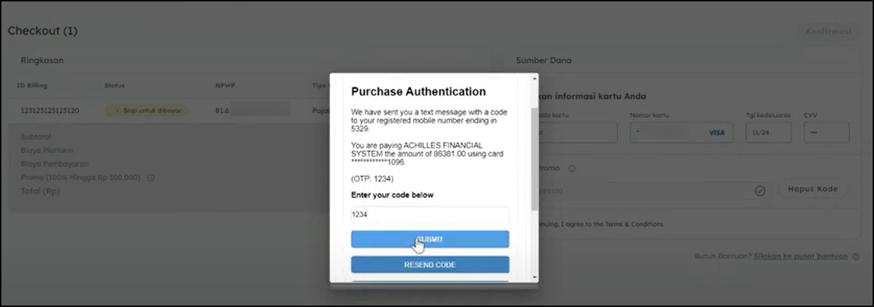 Anda akan menerima kode OTP melalui SMS ke ponsel Anda. Masukkan kode tersebut, lalu klik Submit untuk melanjutkan proses pembayaran.