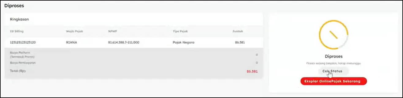 Klik tombol Cek Status. Jika pembayaran berhasil, Anda akan melihat status berubah menjadi Terbayar.
