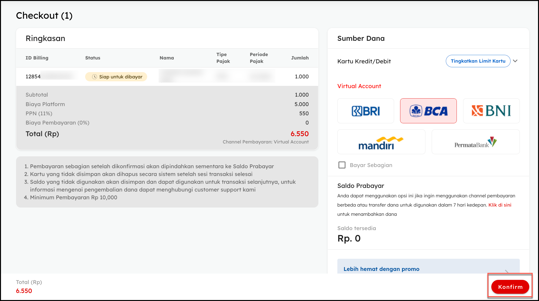 Pastikan nama pemilik nomor virtual account/ nomor rekening sesuai dengan nama perusahaan Anda dan pastikan nominal total sudah sesuai dengan yang di detail pembayaran