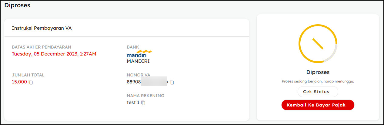 - Setelah Anda melihat detail pembayaran pajak yang berisikan Nama Bank, Deskripsi dan Nomor Virtual Account / Nomor Rekening seperti dibawah ini, maka Anda sudah siap untuk melakukan pembayarannya.
