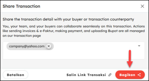 Fitur ini mendukung kolaborasi yang lebih efisien, baik antar tim maupun dengan lawan transaksi. Dengan membagikan tautan transaksi, semua pihak dapat mengakses halaman yang sama secara real-time — memastikan proses yang lebih transparan, terpusat, dan tanpa hambatan.