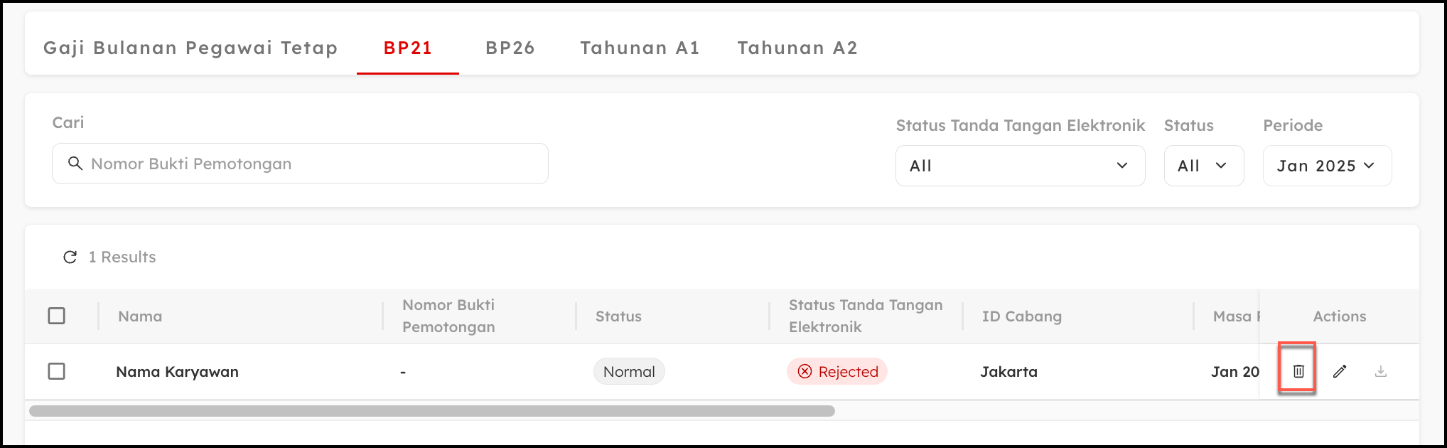 Klik ikon “delete” yang tersedia di samping bukti potong yang ingin dihapus.