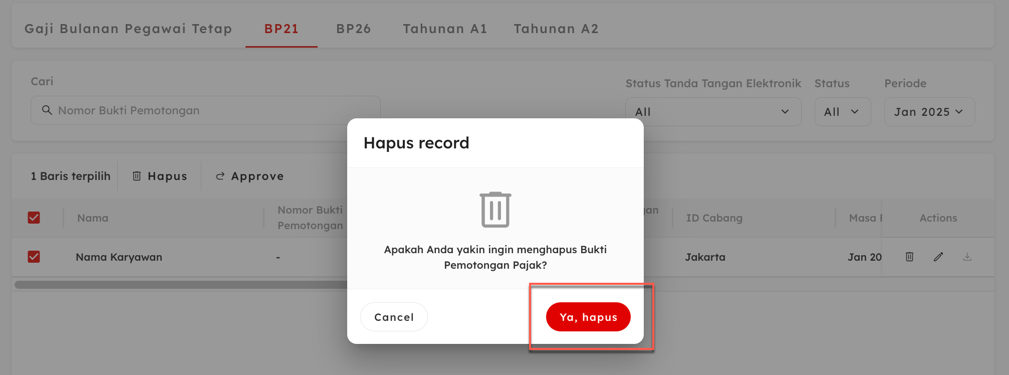 - Konfirmasi Pembatalan. Sebelum bukti potong dibatalkan, akan muncul notifikasi konfirmasi untuk memastikan bahwa Anda benar-benar ingin menghapusnya.