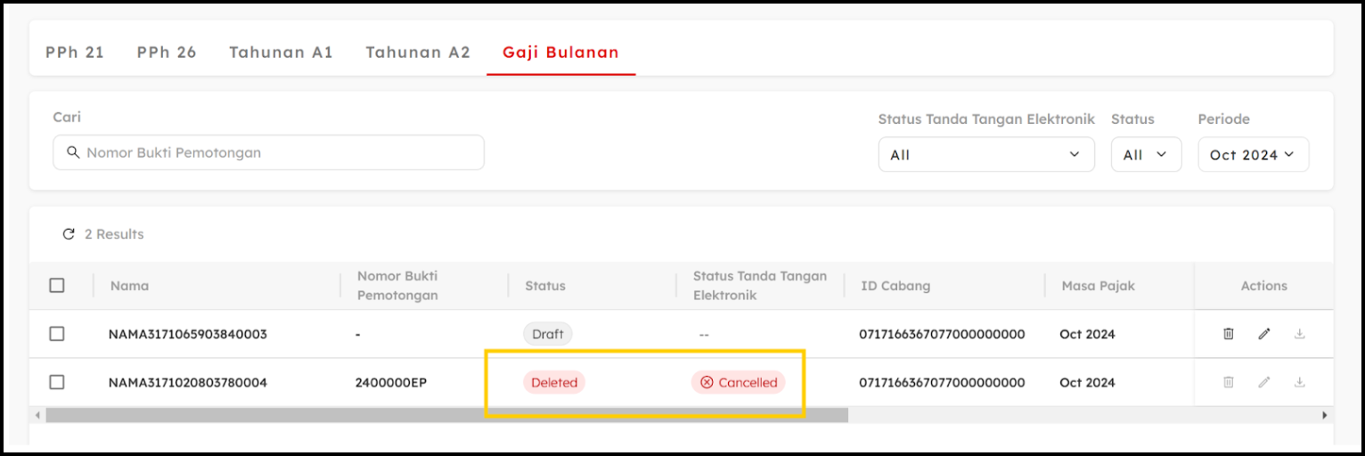 - Status Berubah Menjadi “Deleted”. Setelah dikonfirmasi, bukti potong yang dibatalkan akan otomatis berstatus “deleted” pada menu dashboard.
