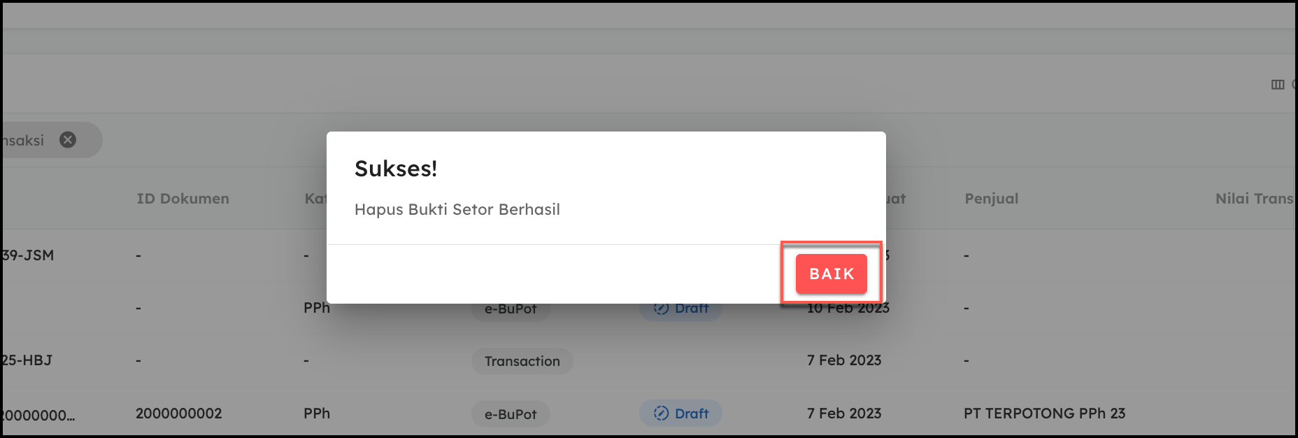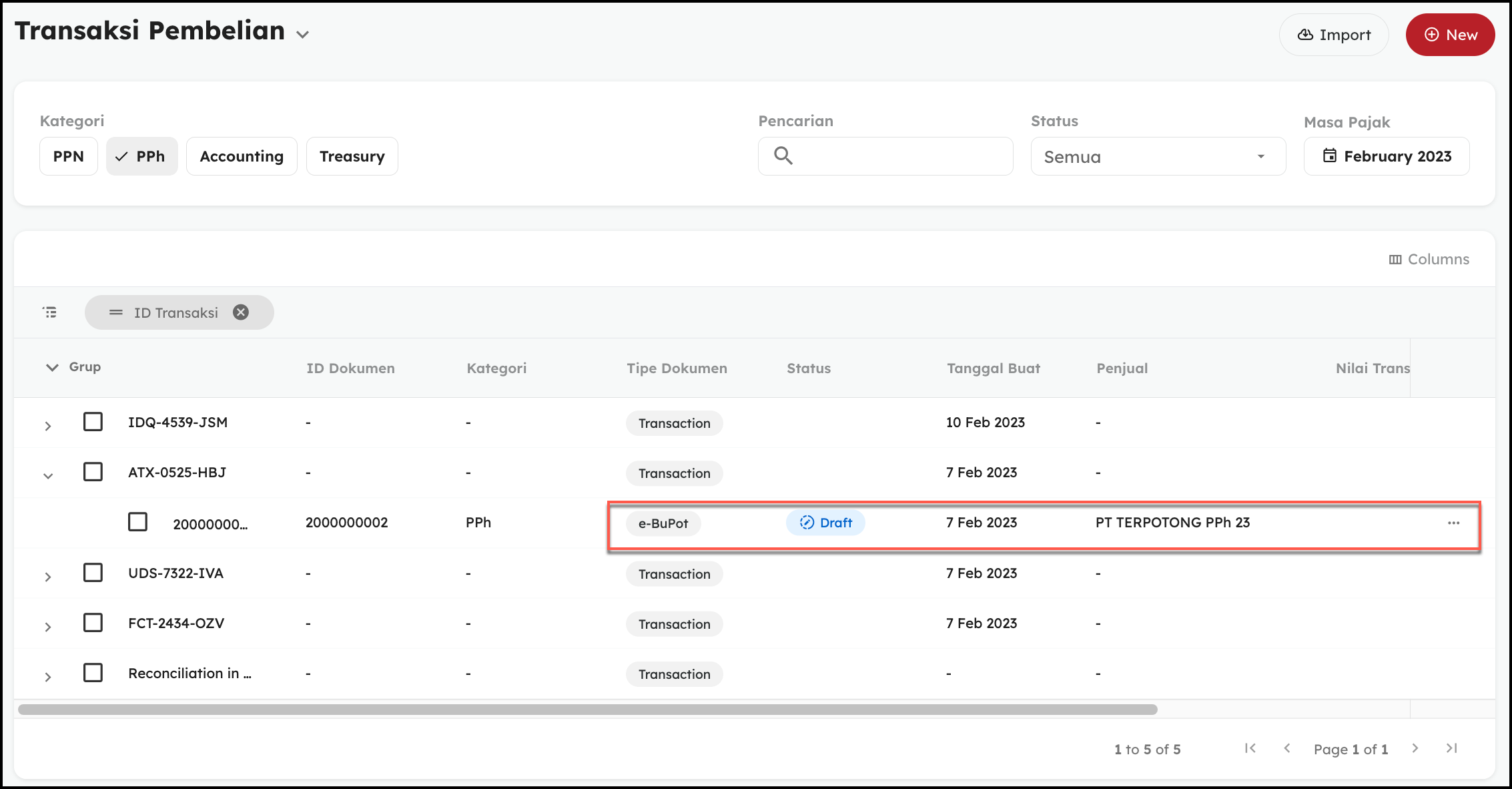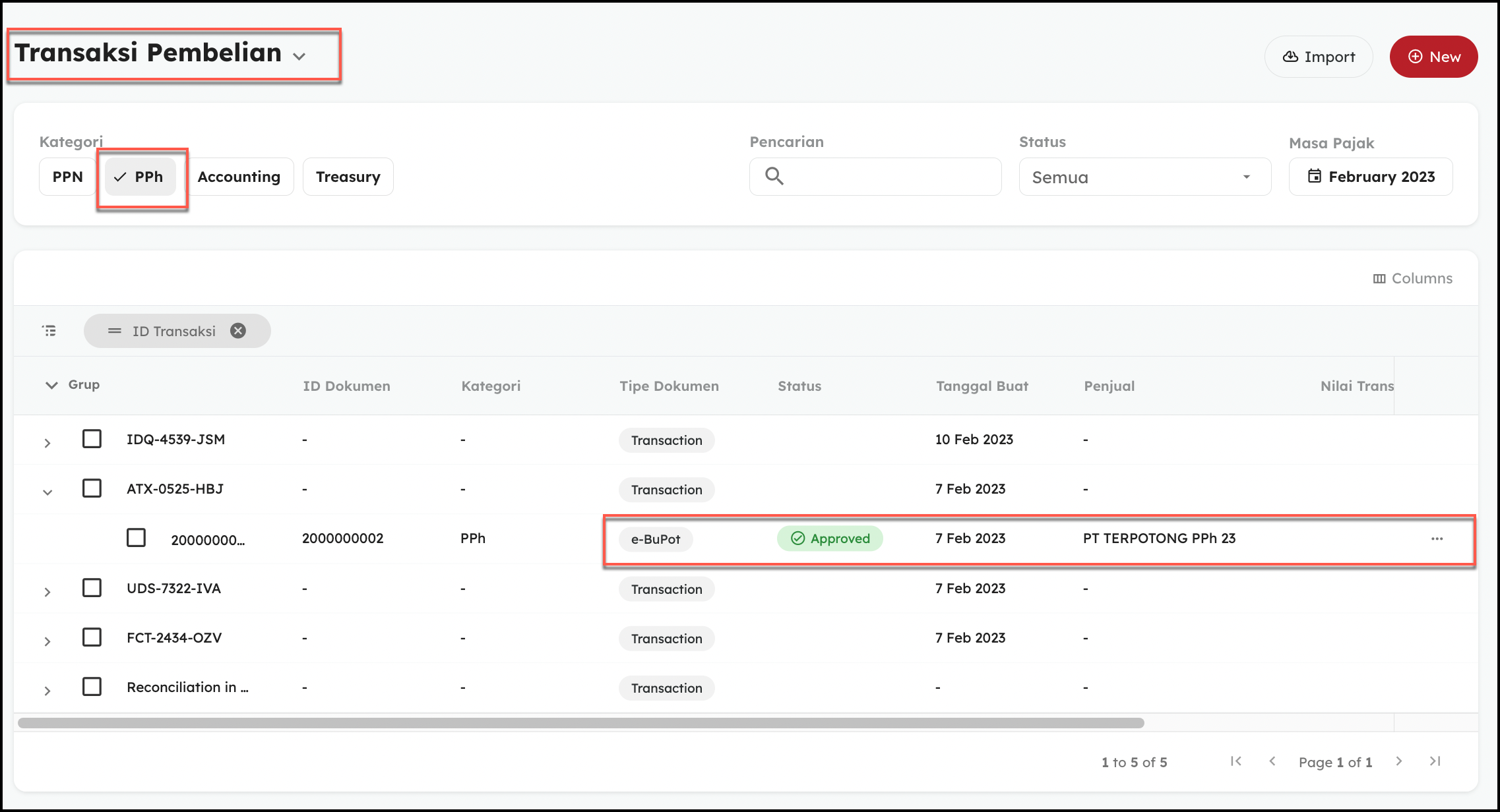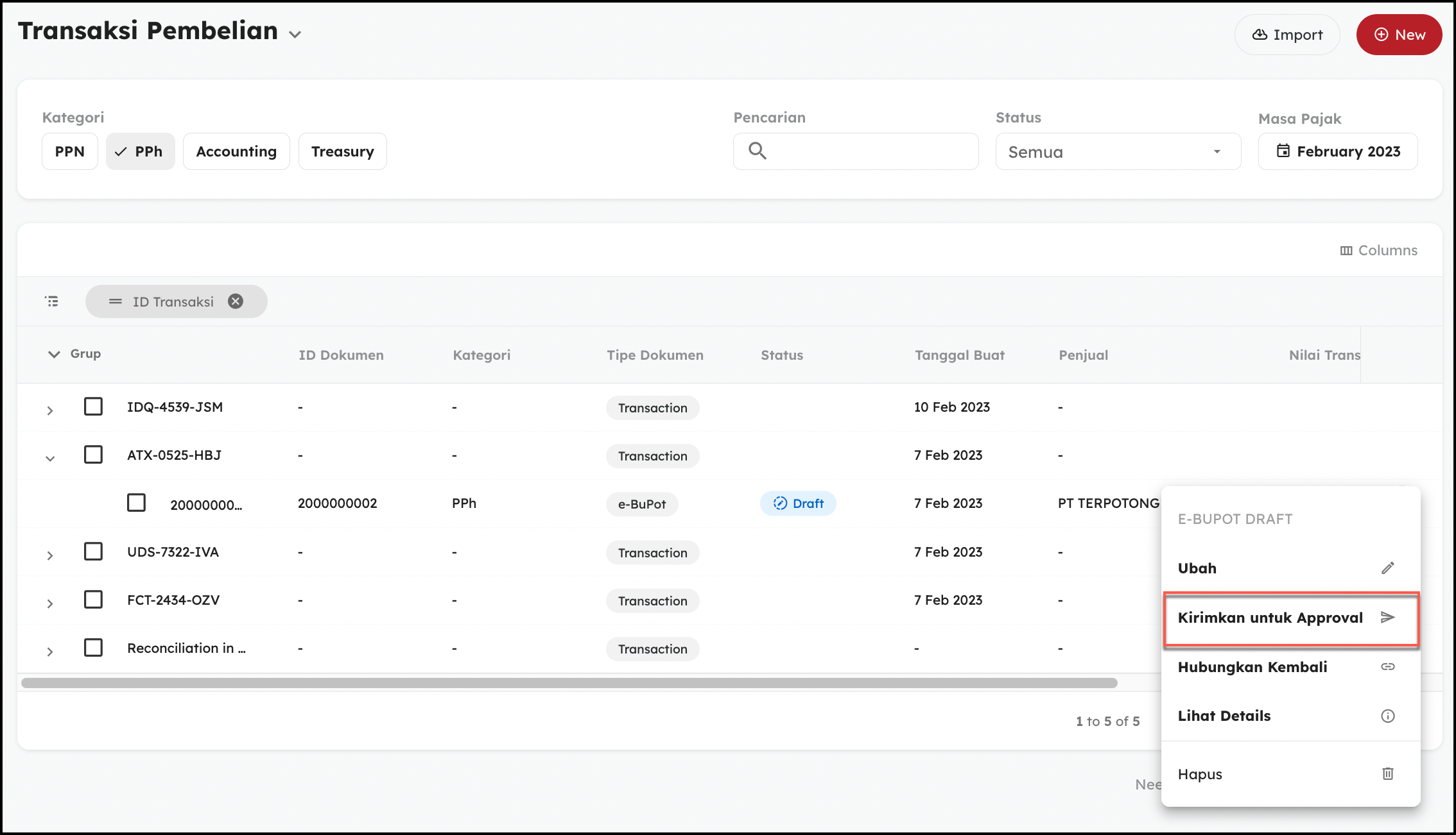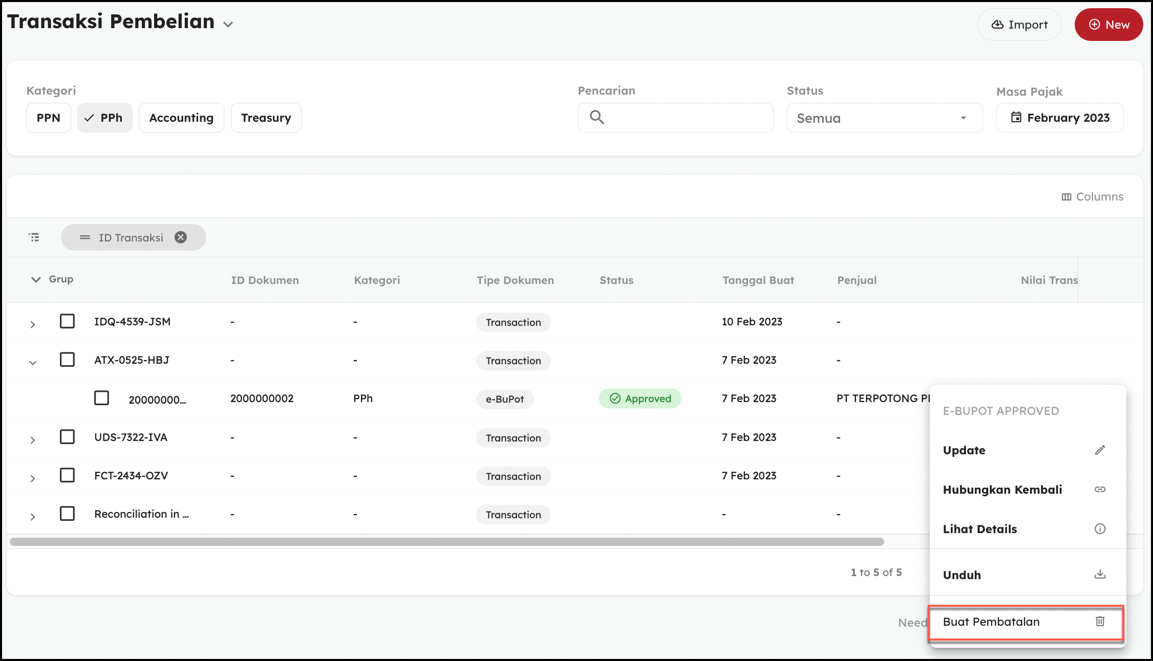 - Pada menu Transaksi Pembelian, Pilih Kategori PPh, lalu klik icon titik tiga pada transaksi yang ingin dihapus