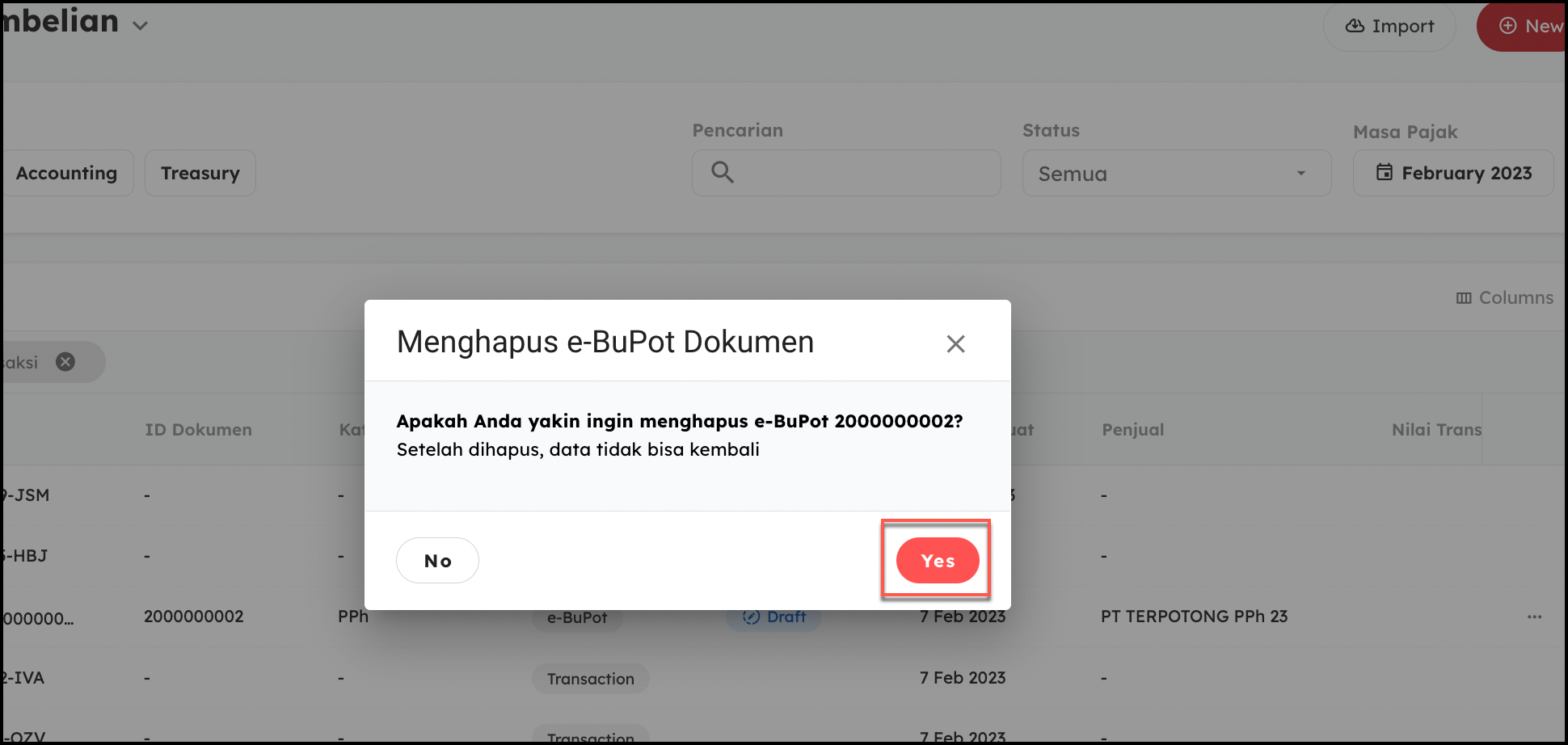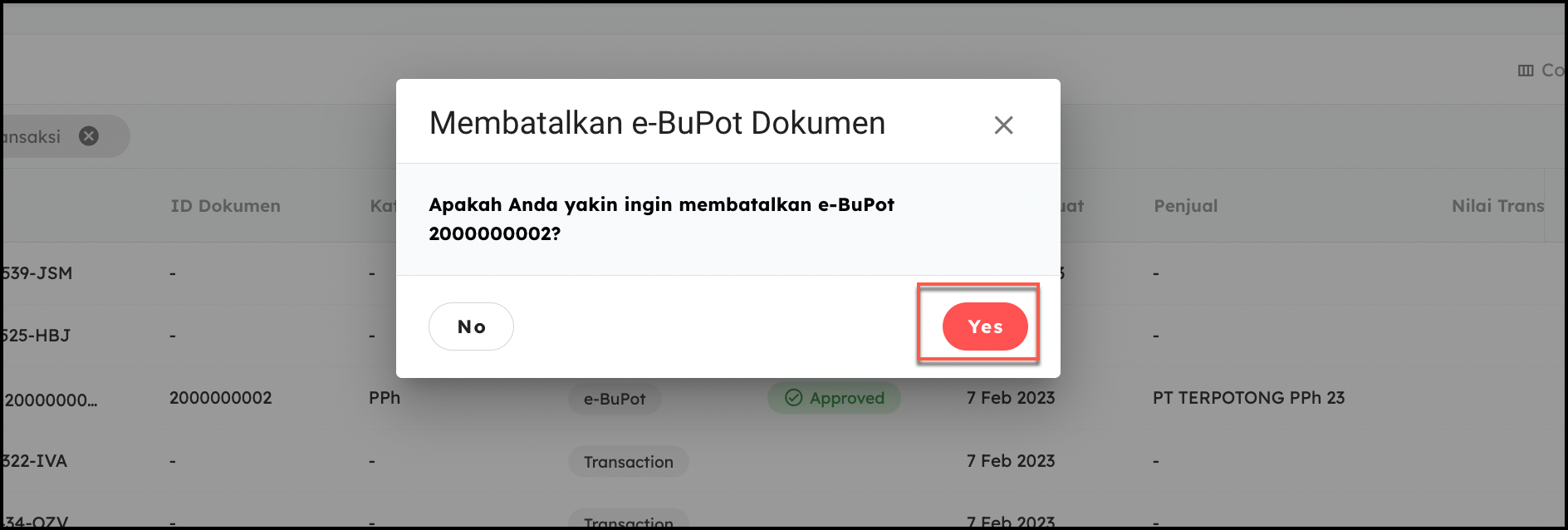 - Konfirmasi kembali pembatalaan/penghapusn eBupot tersebut dengan cara pilih Yes,