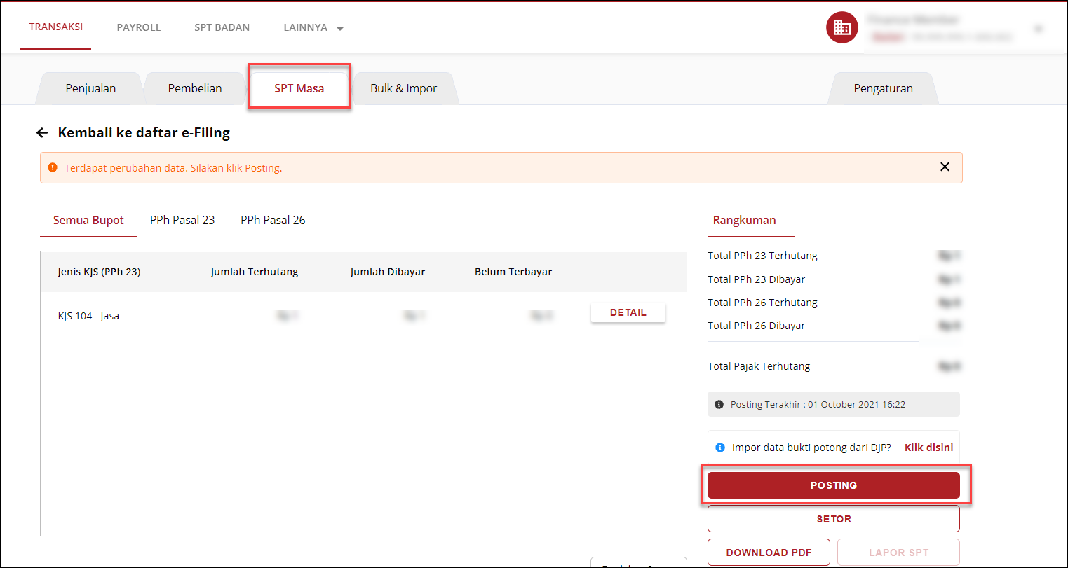 - Karena terdapat perubahan data, Maka harus dilakukan posting kembali sebelum pelaporan. Klik Tab halaman SPT Masa, kemudian klik Posting,