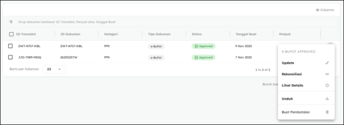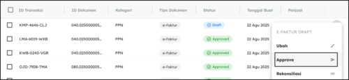 Untuk menyelesaikan proses pembatalan, klik kembali ikon titik tiga di sisi kanan transaksi, lalu pilih Approve agar pembatalan disetujui dan tersimpan.