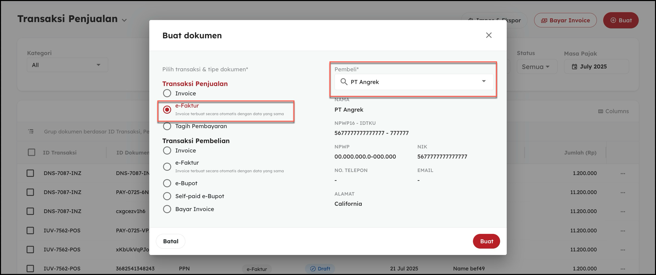 Pilih eFaktur, kemudian pilih nama Pembeli, setelah itu klik tombol Buat.
