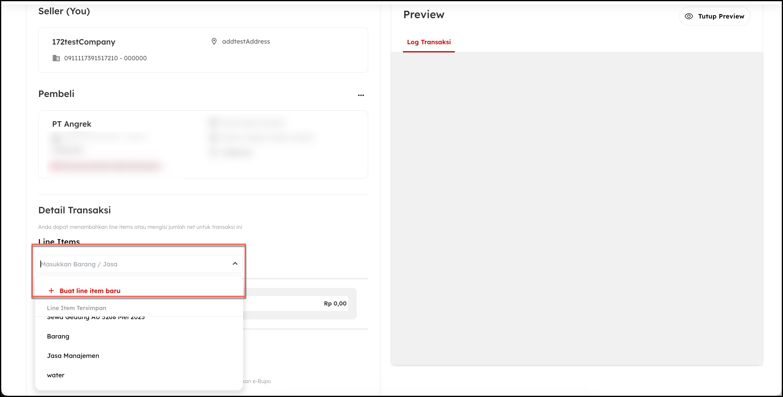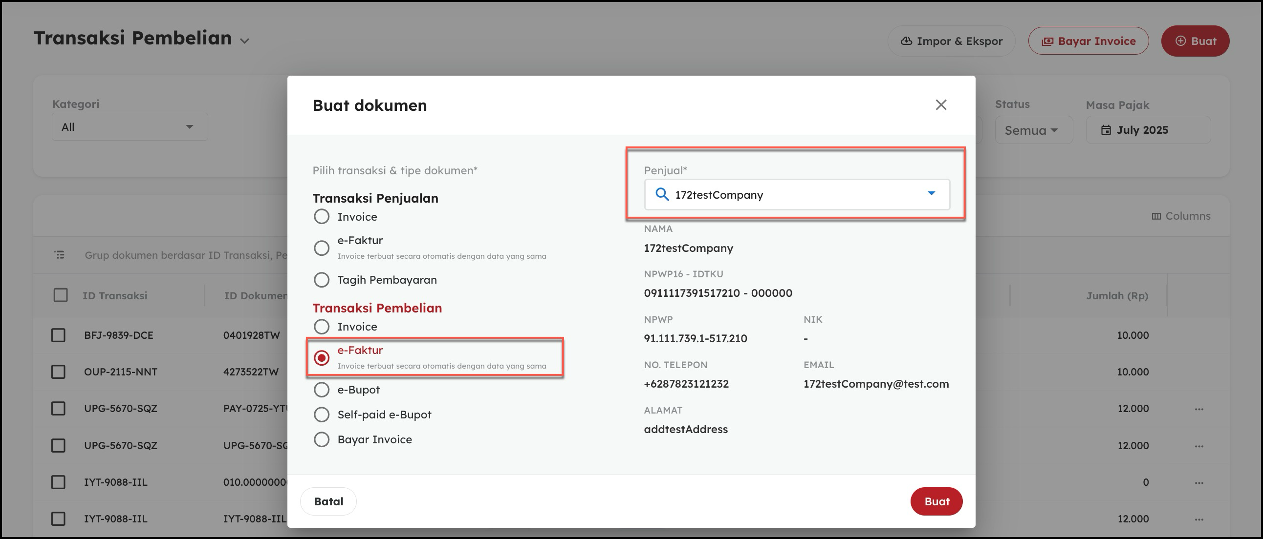 Pada menu Transaksi Penjualan pilih eFaktur, kemudian lengkapi lawan transaksi atau nama vendor, kemudian klik Buat.