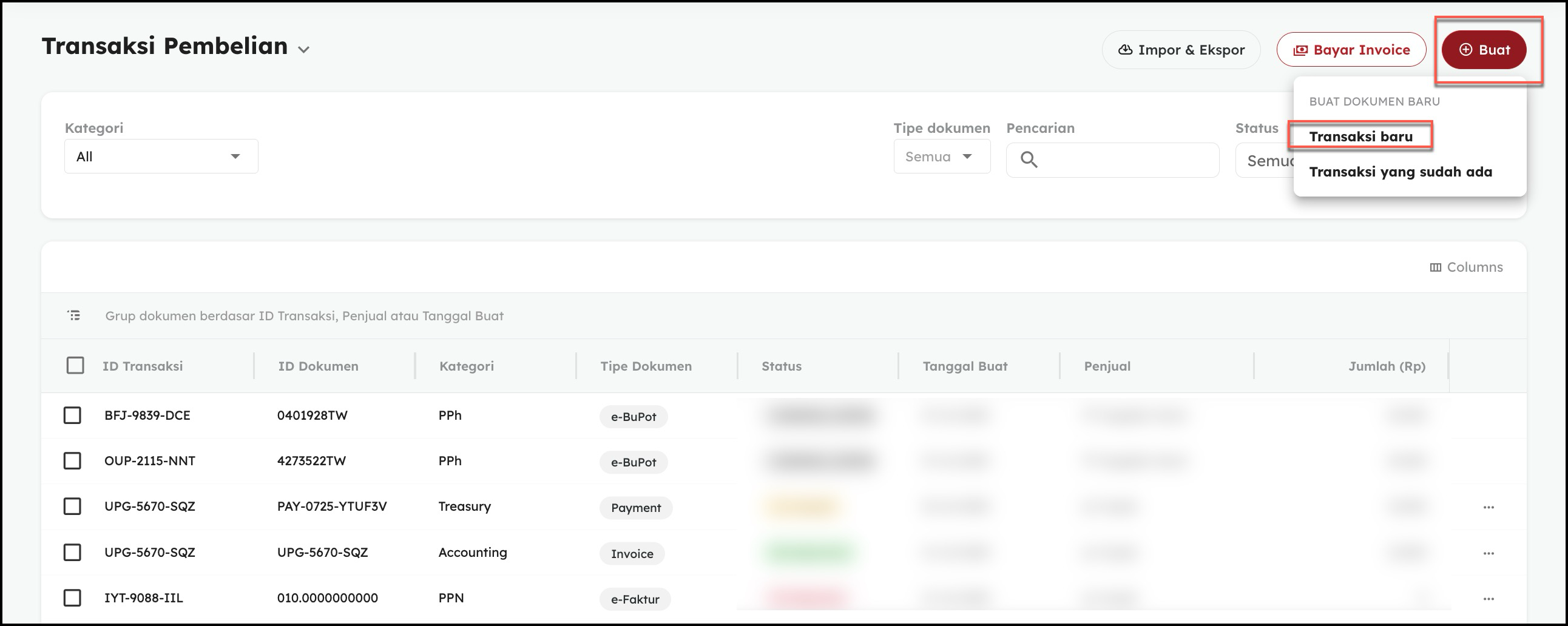 Pastikan Anda beraada di Transaksi Pembelian, kemudian klik Buat dan pilih Transaksi Baru.