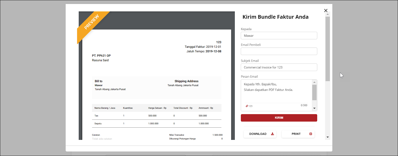 - Ketika Anda memilih Simpan dan Kirim akan muncul halaman berikut (Anda dapat mengirim faktur tersebut ke email pembeli, Anda juga dapat mengunduh dan mencetaknya langsung)