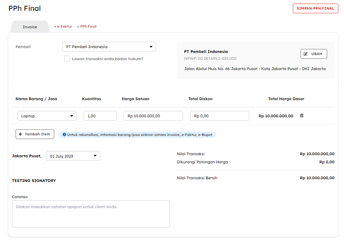 - Jika ingin membuat transaksi PPh Final, Klik pada Tab PPh Final, lengkapi dan periksa kembali transaksi tersebut, untuk memastikan data yang diinput sudah sesuai. Jika telah sesuai, klik Tombol Simpan PPh Final,