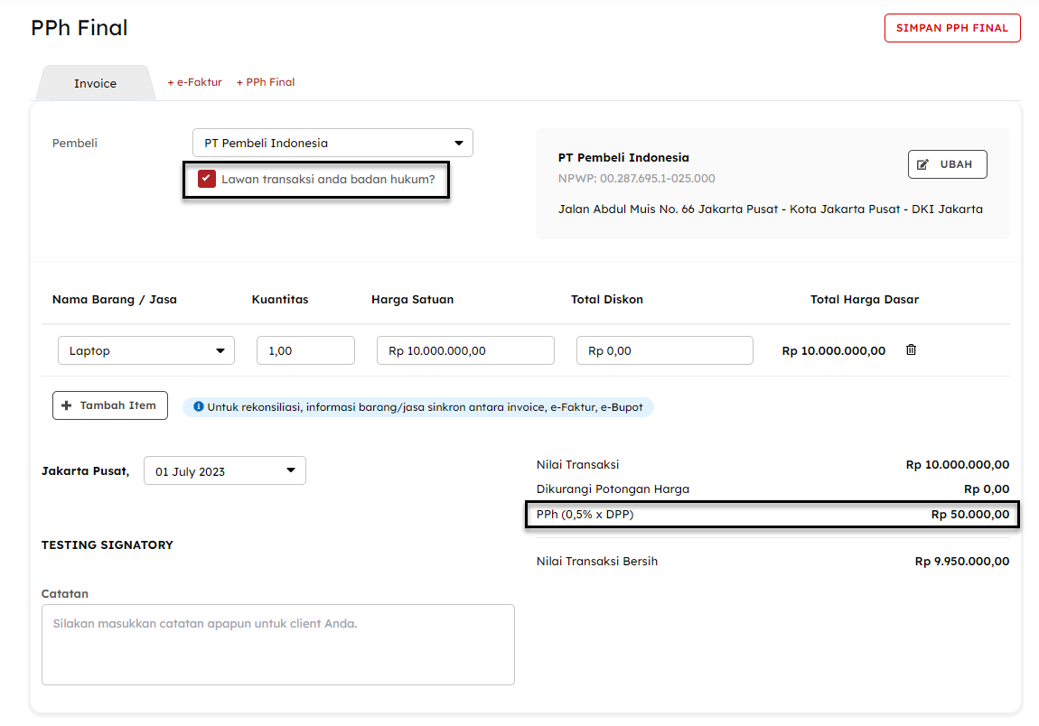 Jika Lawan Transaksi Anda merupakan badan hukum silakan centang pada bagian Lawan Transaksi anda badan hukum? Untuk menambahkan 0.5% Pengurang pada Invoice tersebut