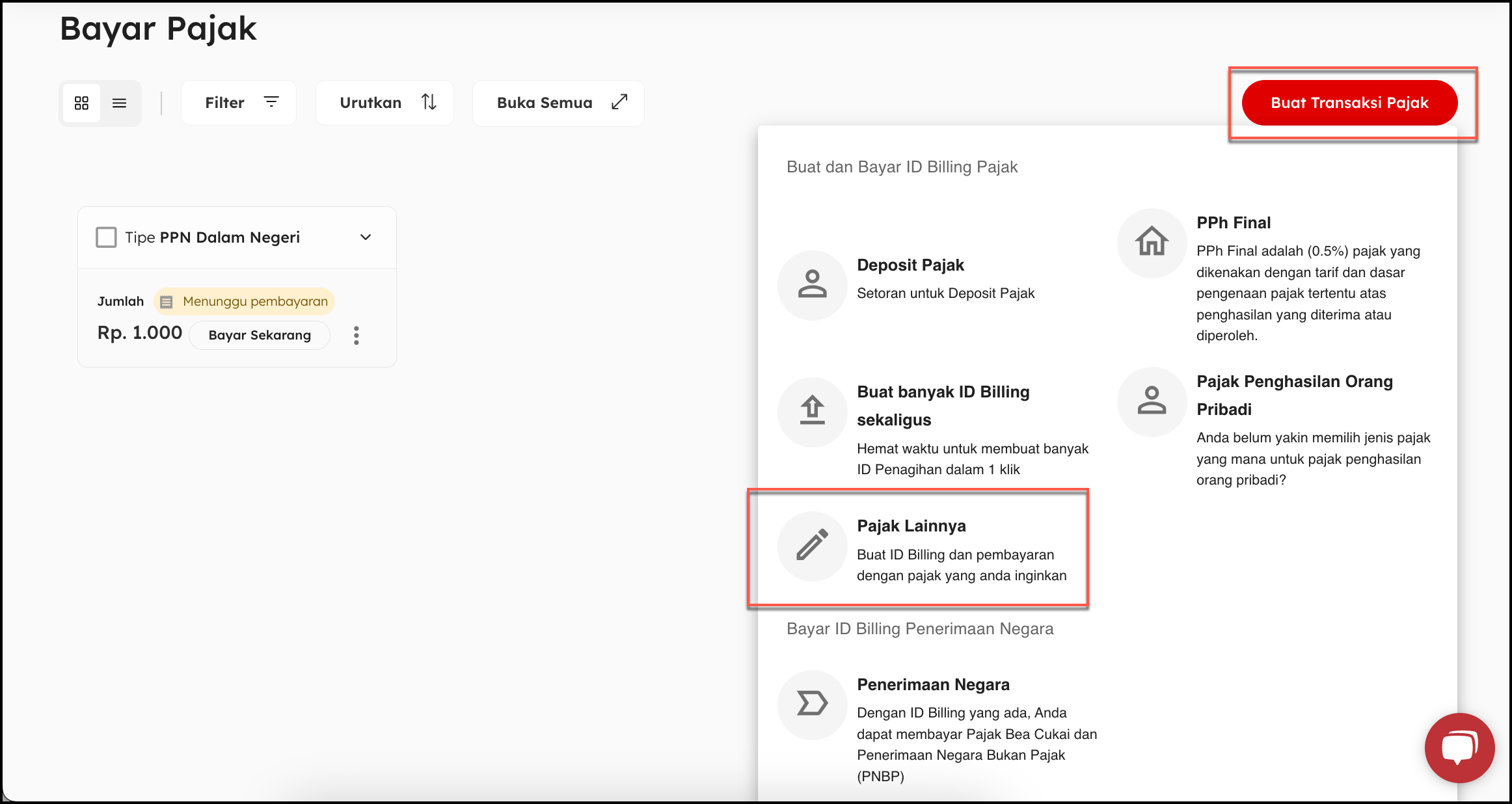 - Lalu klik Buat Transaksi Pajak, dan pilih jenis Pajak Lainnya,