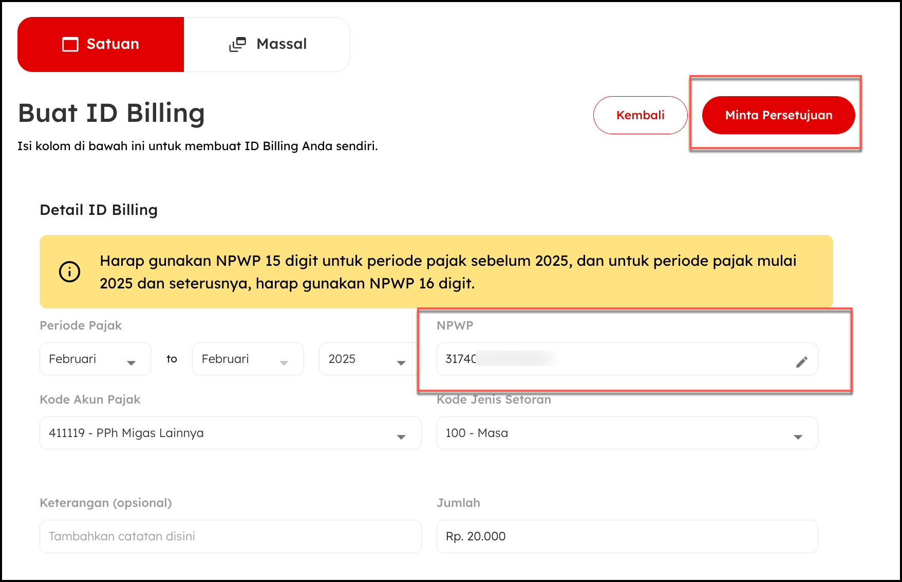 - Pilih Periode dan tahun pajak, tuliskan NPWP yang akan Anda bayarkan beserta Kode Akun Pajak dan Kode Jenis Setoran yang sesuai, setelah itu klik Minta Persetujuan.