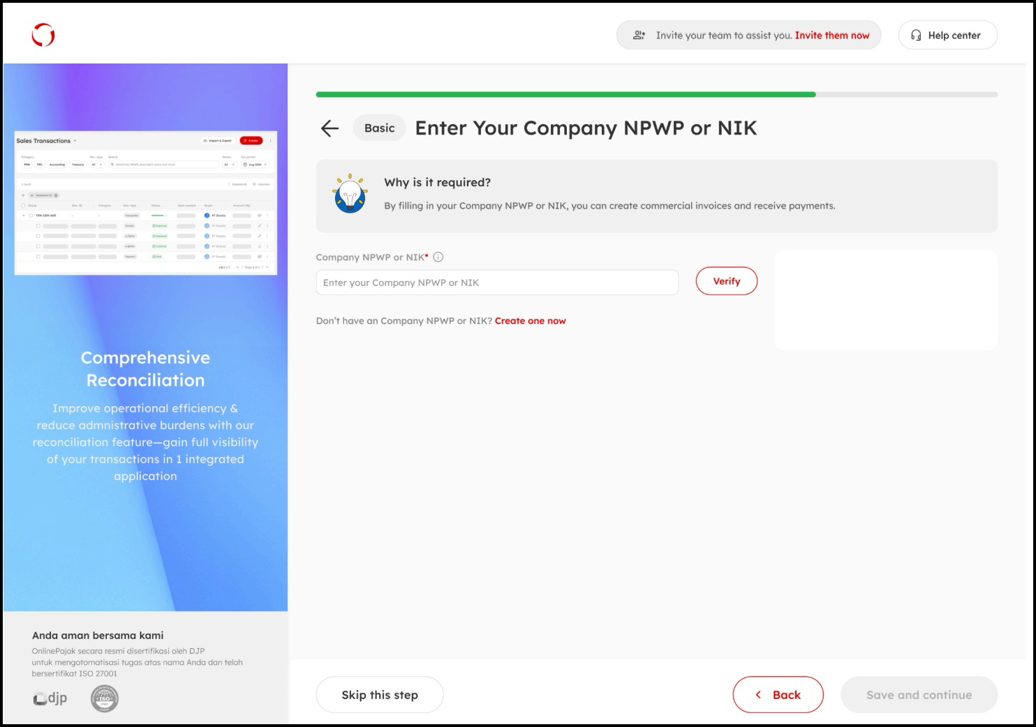 - Langkah selanjutnya, masukkan NPWP16 Perusahaan Anda. Klik tombol “Verifikasi” untuk memverifikasi nomor tersebut.