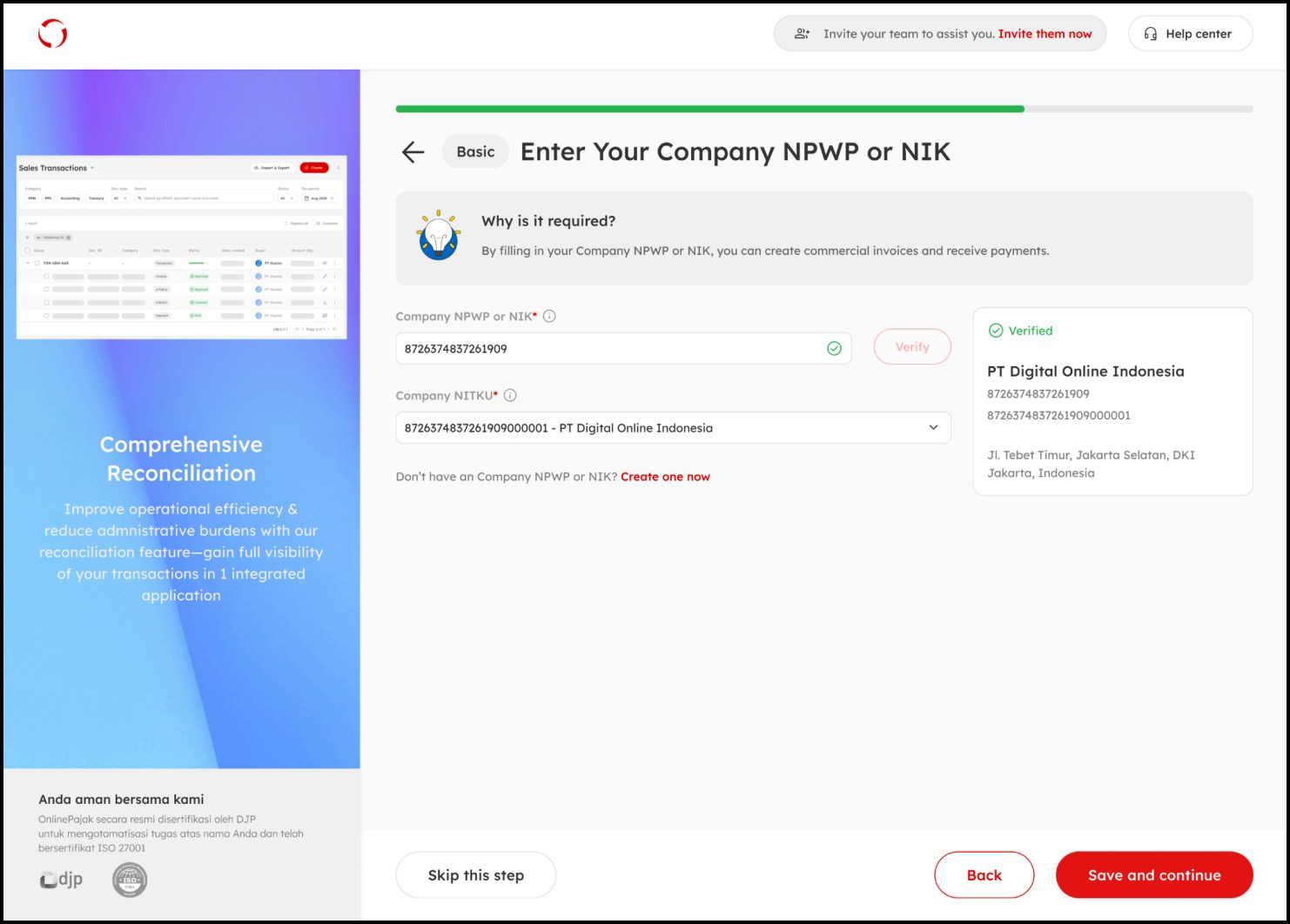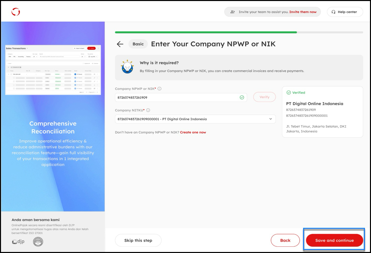 - Sistem akan secara otomatis memvalidasi NPWP Anda, sehingga menampilkan Detil Perusahaan Anda (Nama, NPWP16 & NITKU dan Alamat)