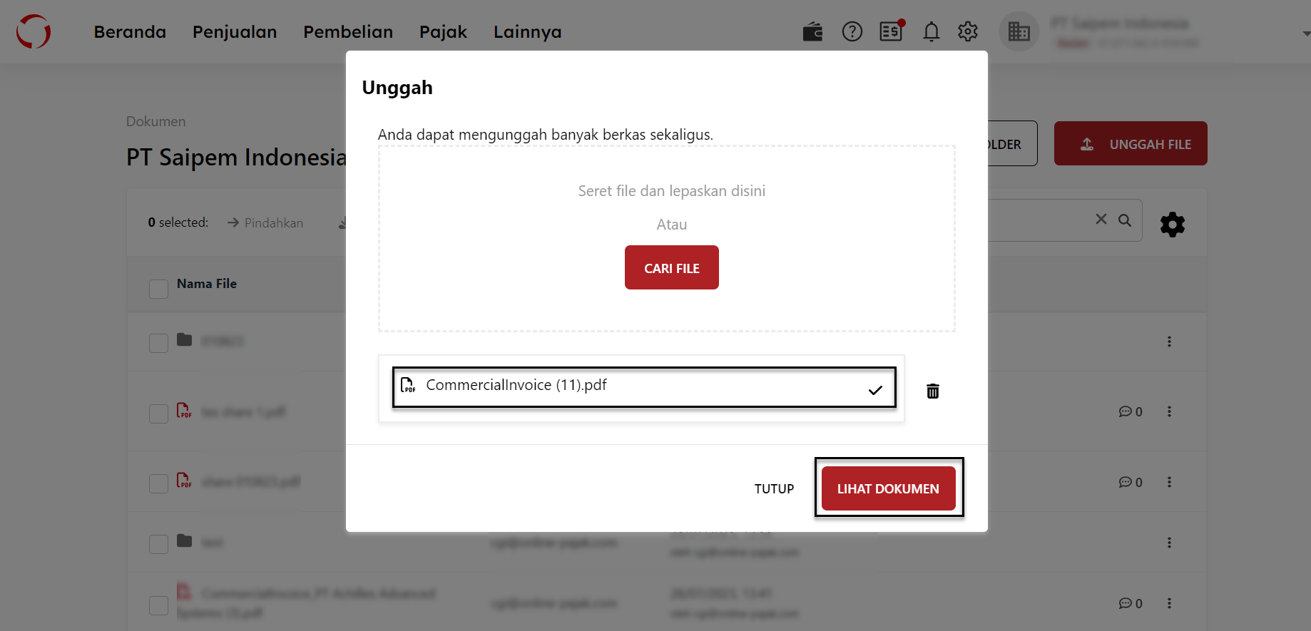 Setelah dokumen berhasil terupload, Klik Tombol Lihat Dokumen untuk melihat daftar dokumen yang telah diupload