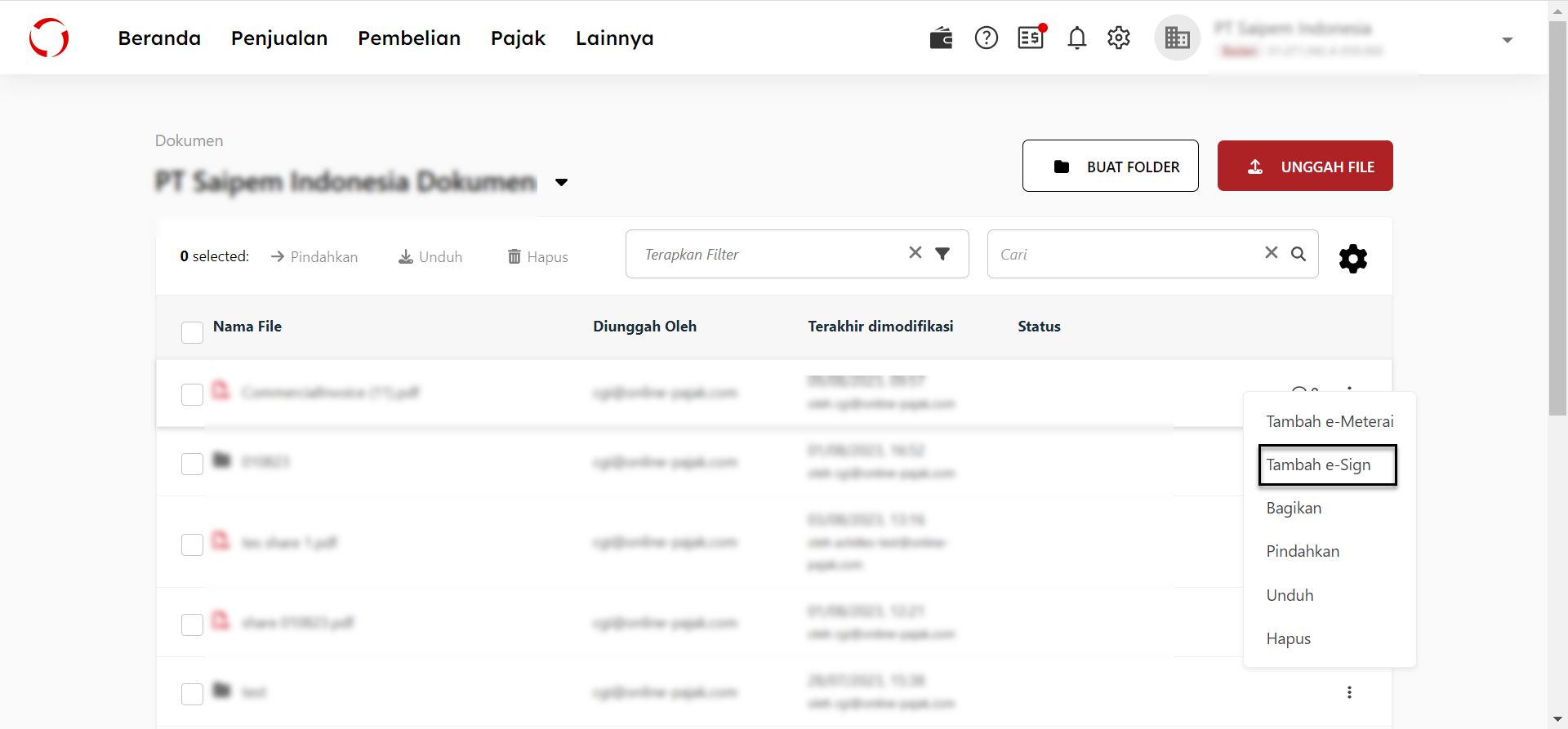 Untuk menandatangani dokumen, klik titik 3 pada menu disamping dokumen, kemudian pilih Opsi Tambah e-Sign