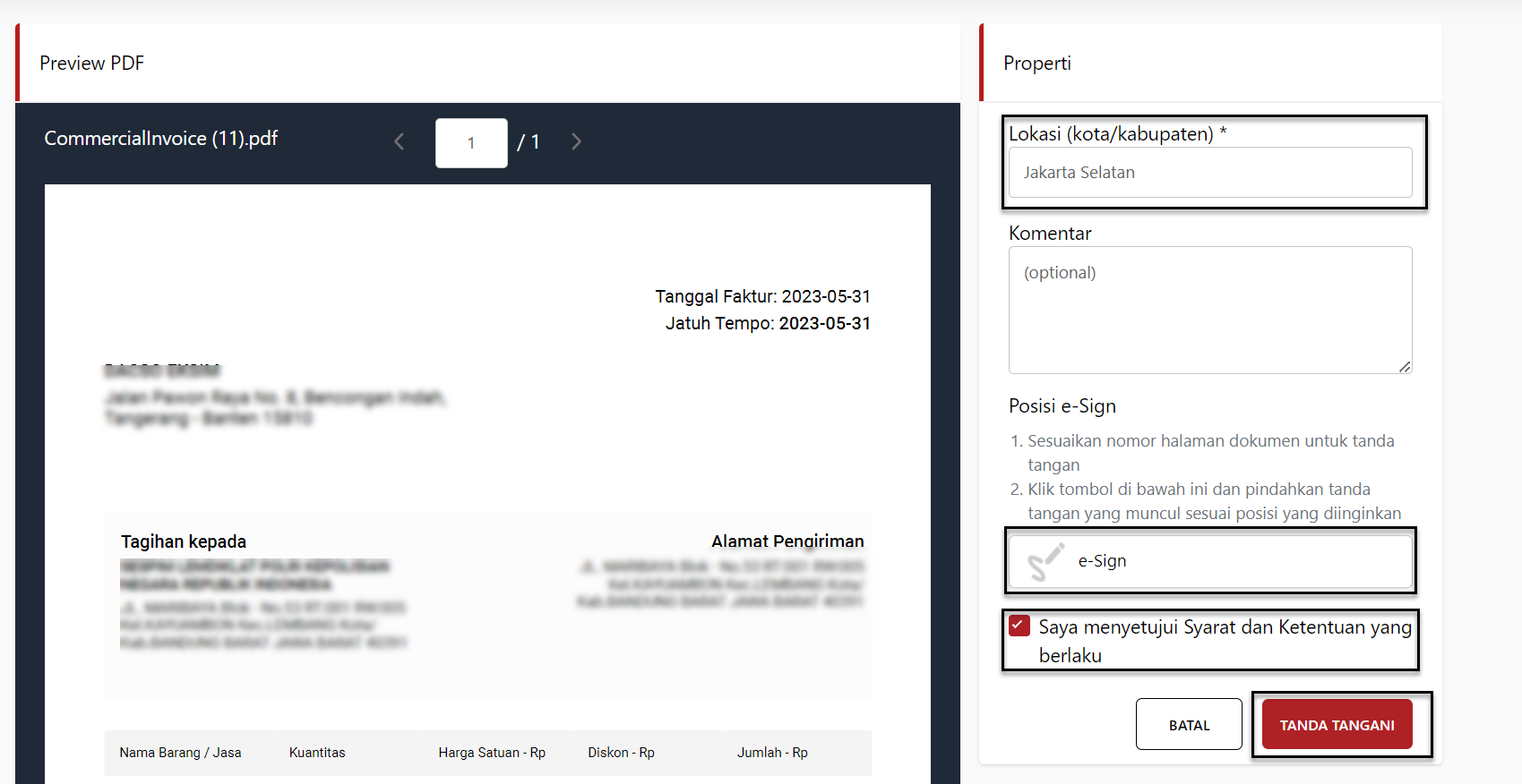 Akan muncul halaman preview dokumen seperti di bawah ini. Isi detil lokasi – tempatkan tandatangan sesuai dengan yang diinginkan – centang syarat dan ketentuan – kemudian jiak sudah sesuai klik Tanda Tangani