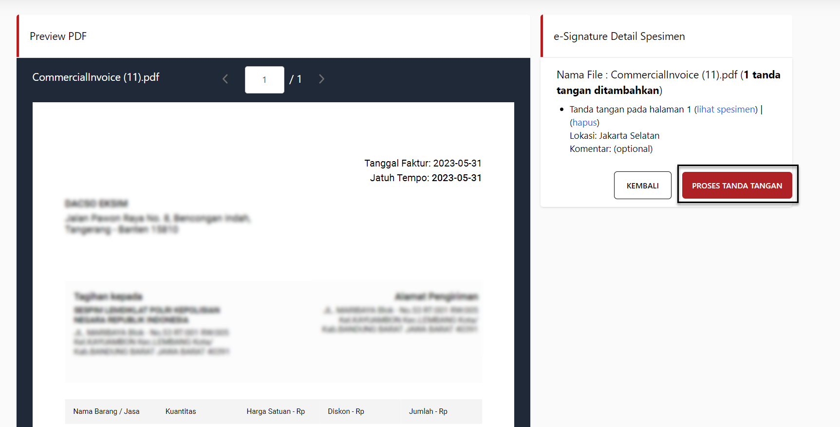 - Akan muncul konfirmasi eSignature Detail Spesimen, Periksa kembali lalu klik Proses Tanda Tangan