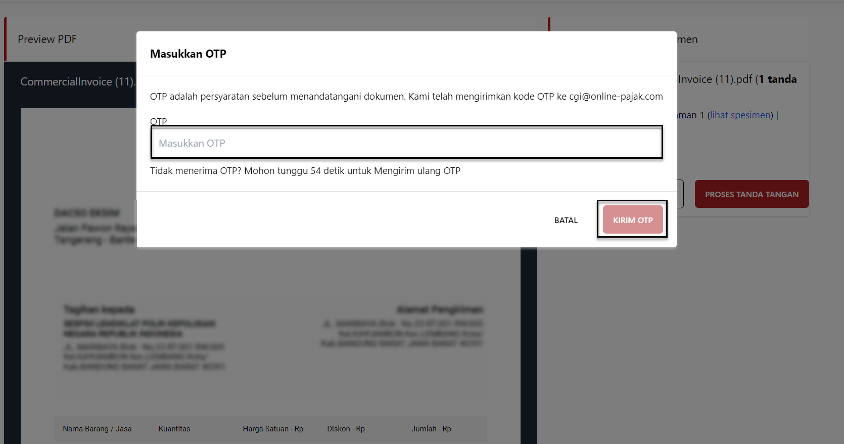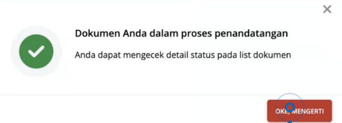 Akan muncul notifikasi sebagai berikut jika OTP sudah benar, kemudian klik tombol Oke, Mengerti untuk kembali ke list dokumen