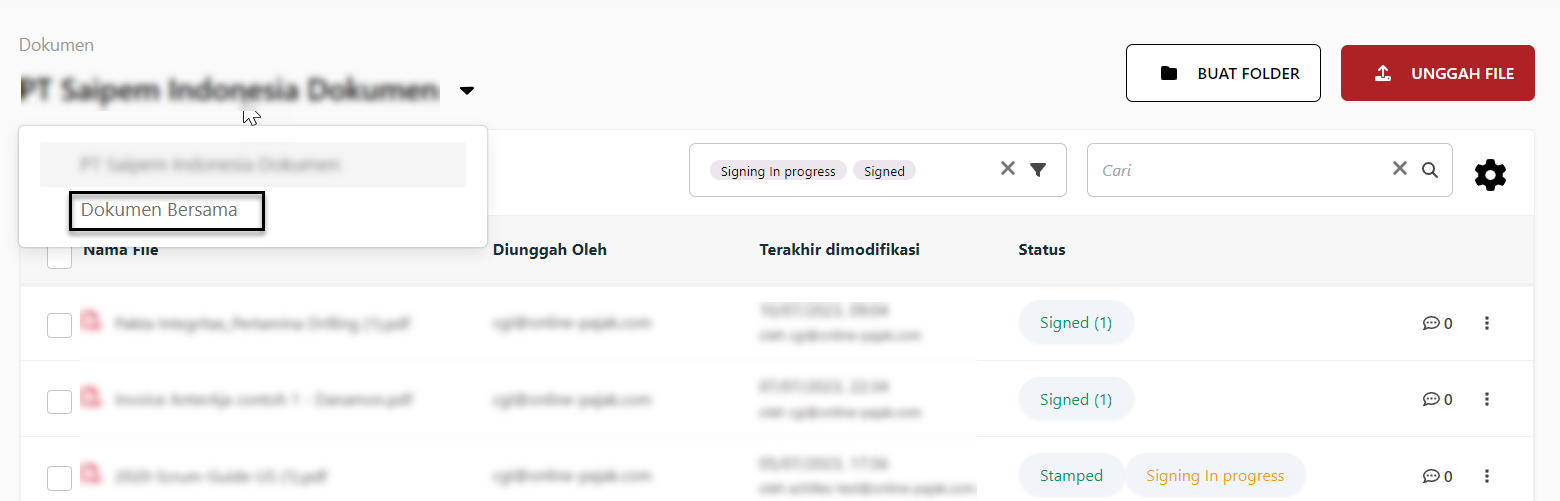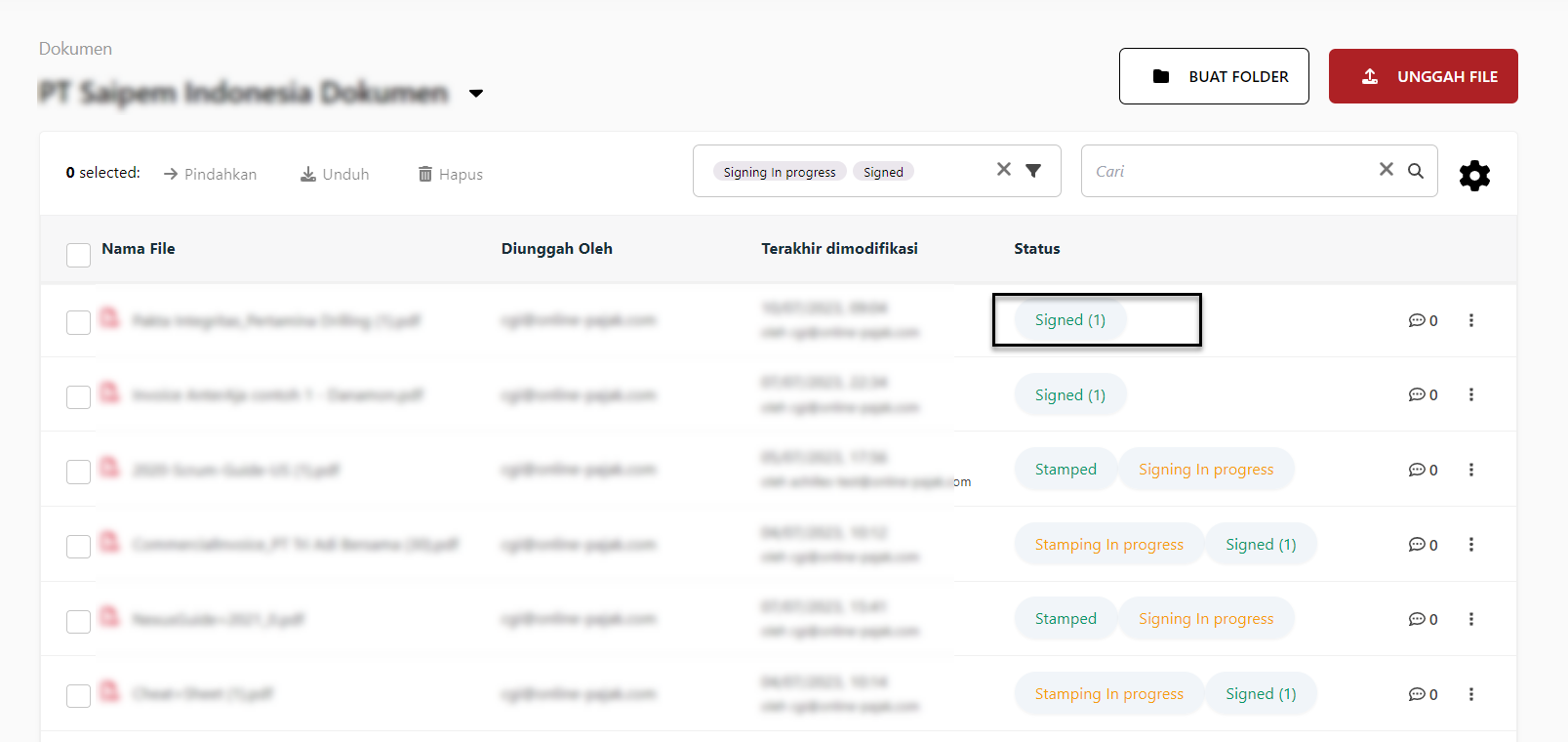 Pada dokumen yang ada di dalam folder, akan muncul status Signing In Progress jika masih dalam proses tandatangan, dan akan muncul Signed jika dokumen sukses ditandatangani