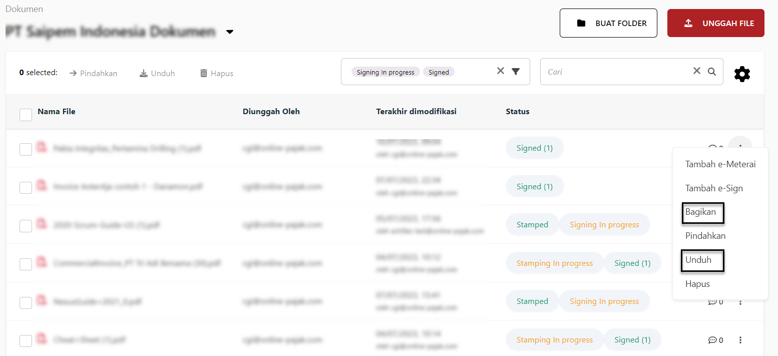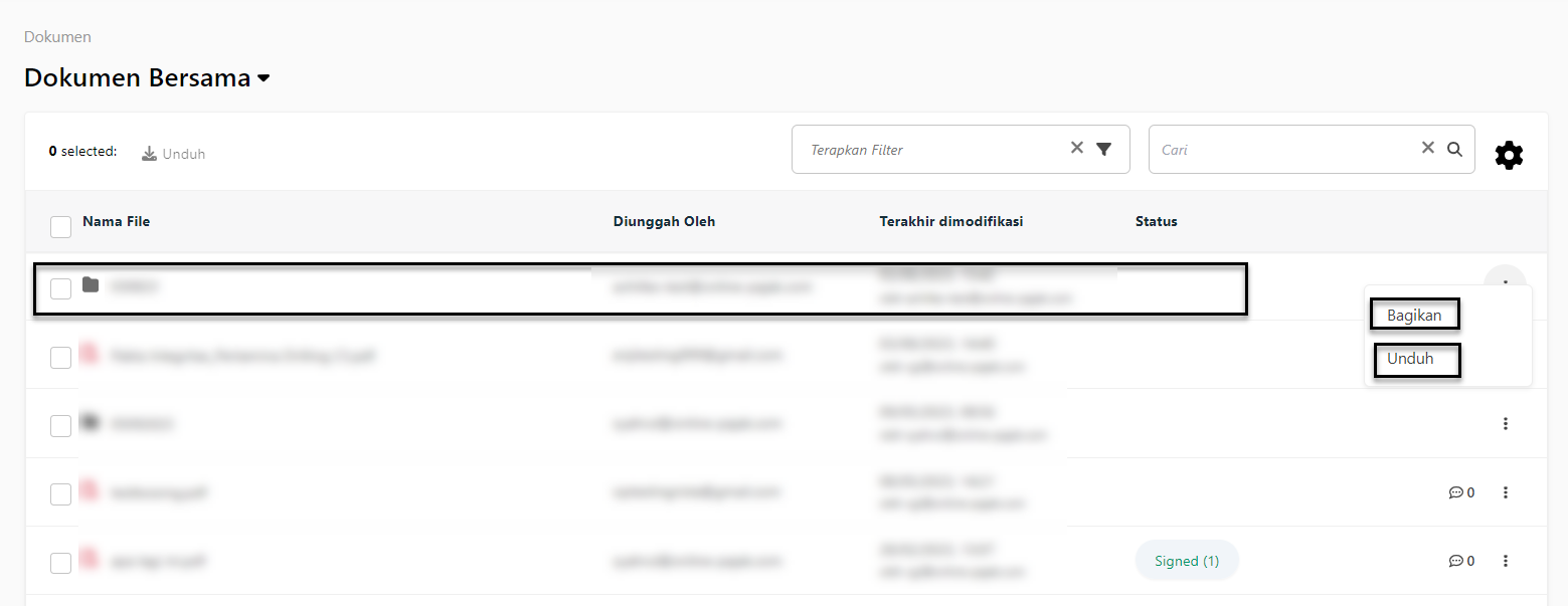 - Proses selesai, Dokume/folder yang telah Anda tanda tangani siap di Unduh secara bulk atau dibagikan melalui email kepada Rekan Anda. Klik titik tiga disamping folder yang telah ditanda tangani lalu pilih opsi Bagikan dan/atau Unduh