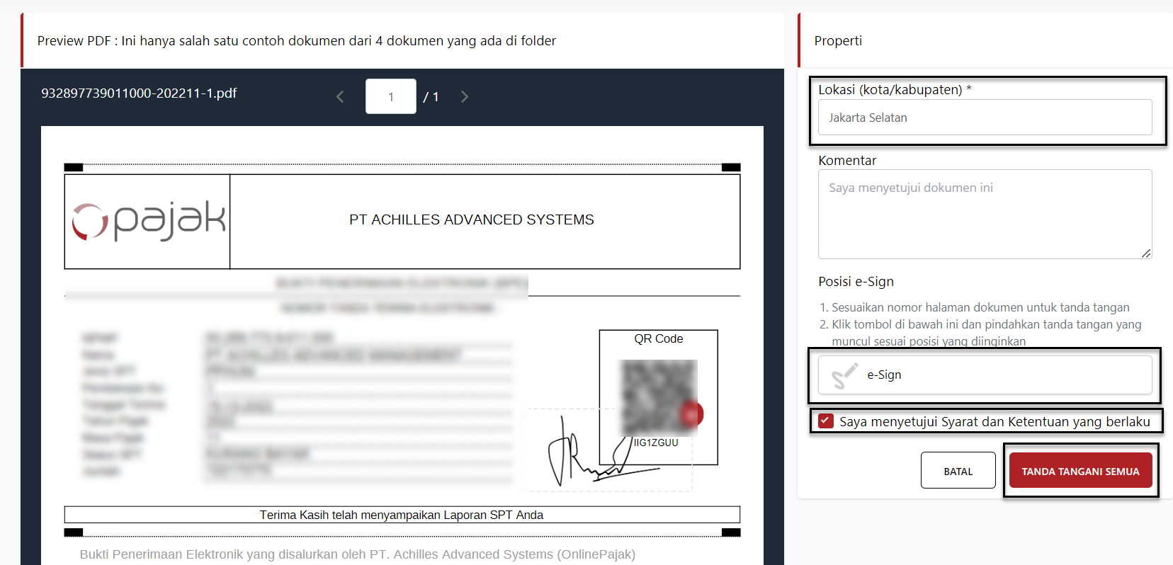 Kemudian akan muncul preview salah satu dokumen yang ada di folder tersebut. Isi data lokasi, dan tentukan posisi tanda tangan. Kemudian centang bagian syarat dan ketentuan, dan klik Tanda tangani Semua