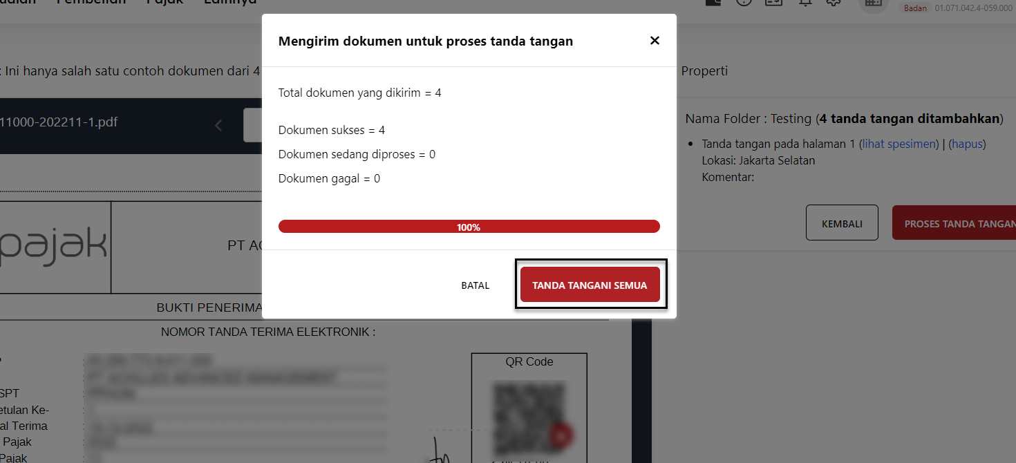 Sistem Akan memproses penandatanganan untuk keseluruhan dokumen, Jika dokumen sudah 100% sukses, Klik tombol Tanda Tangani Semua