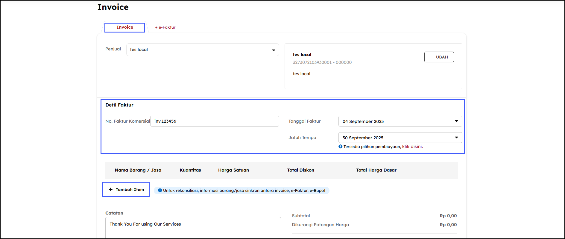 Anda akan diarahkan ke halaman pembuatan Invoice. Klik tab Invoice dan lengkapi data berikut:- Nomor invoice