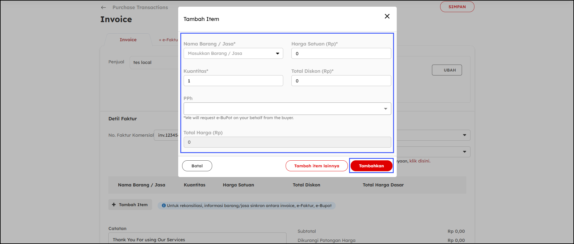 - Kemudian klik Tambah Item untuk melengkapi Jasa atau Barang yang dijual.