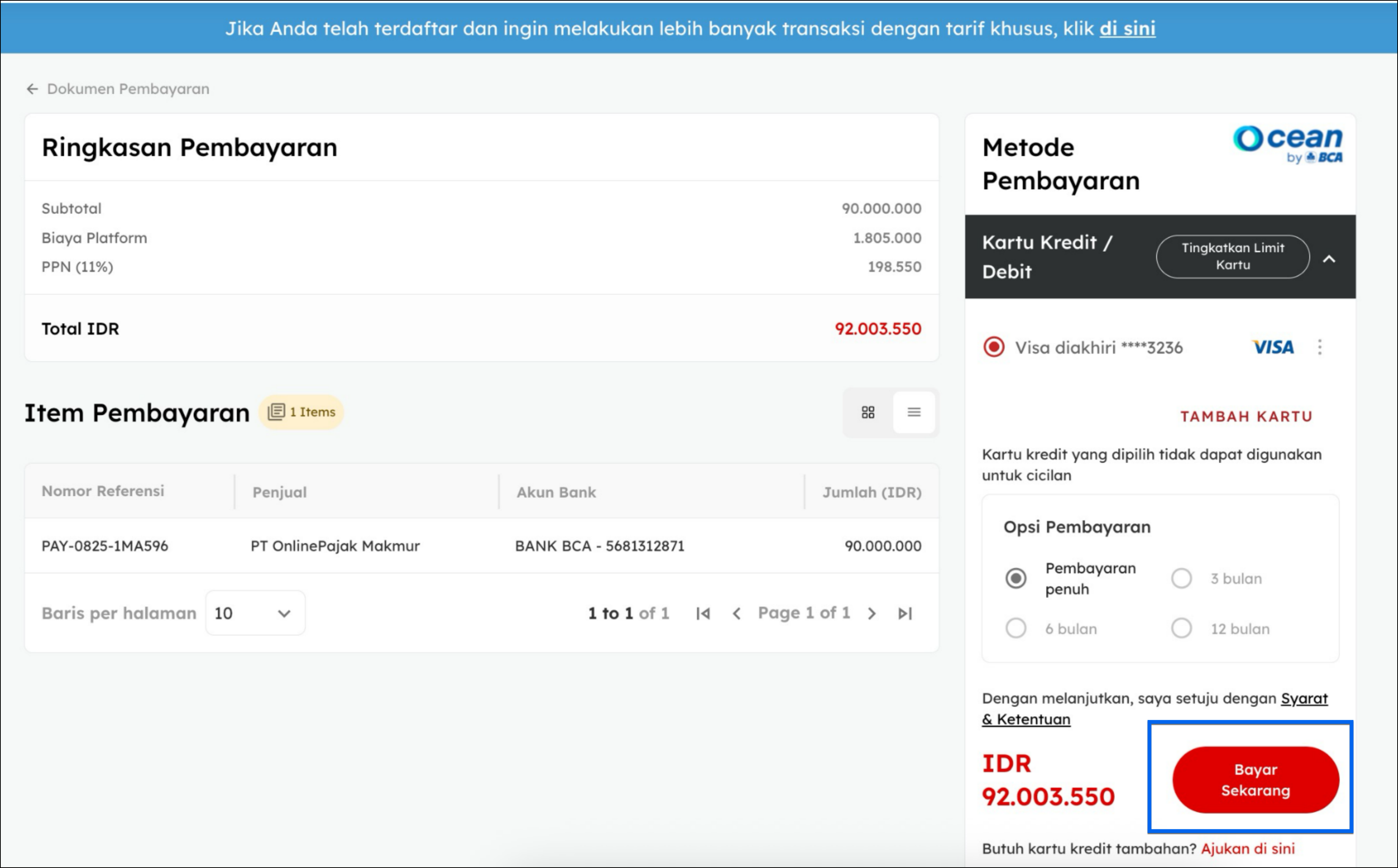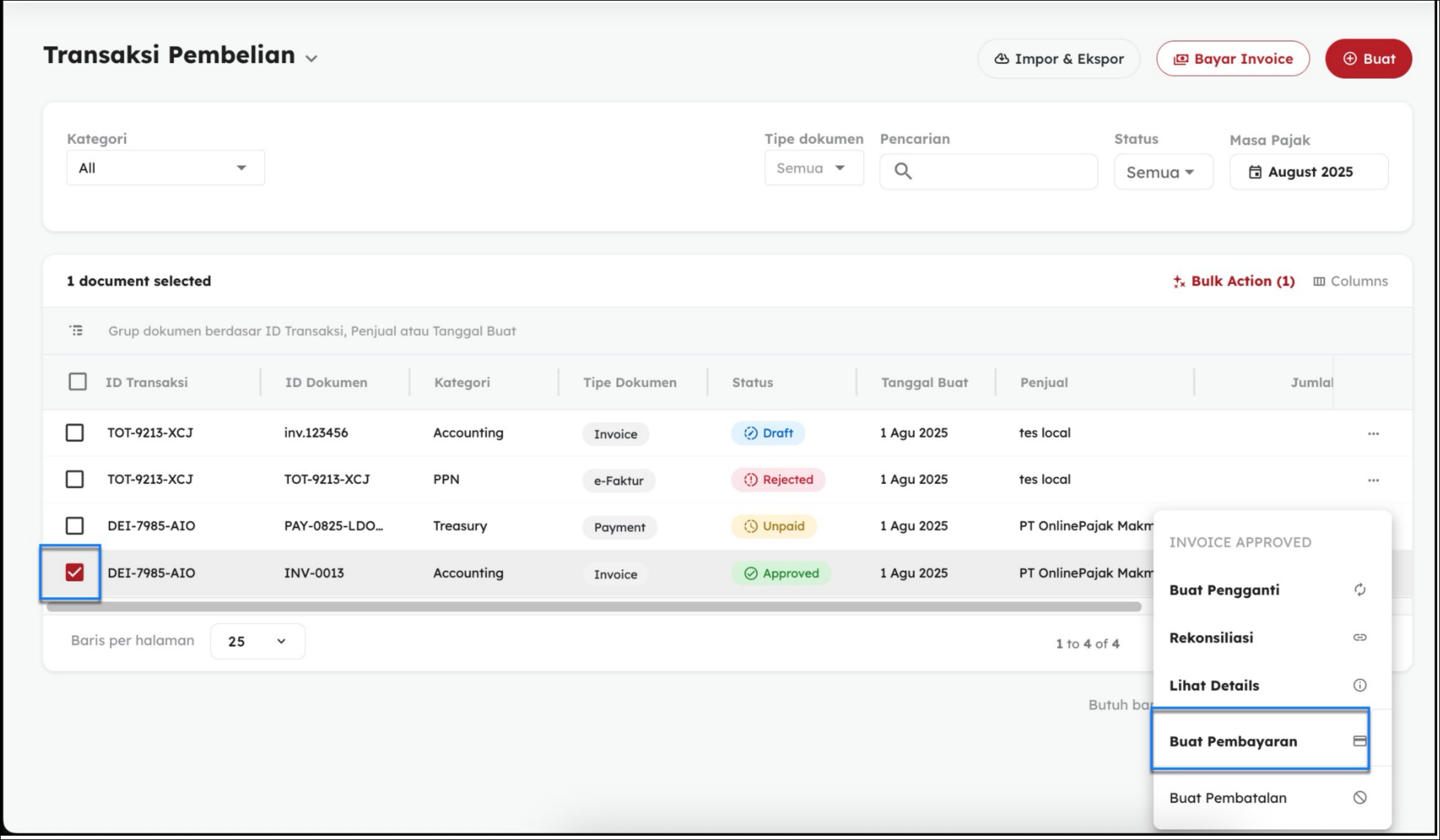 Setelah invoice selesai dibuat, pastikan statusnya adalah Approve, kemudian Anda dapat membayar invoice tersebut dengan cara klik menu Buat Pembayaran.