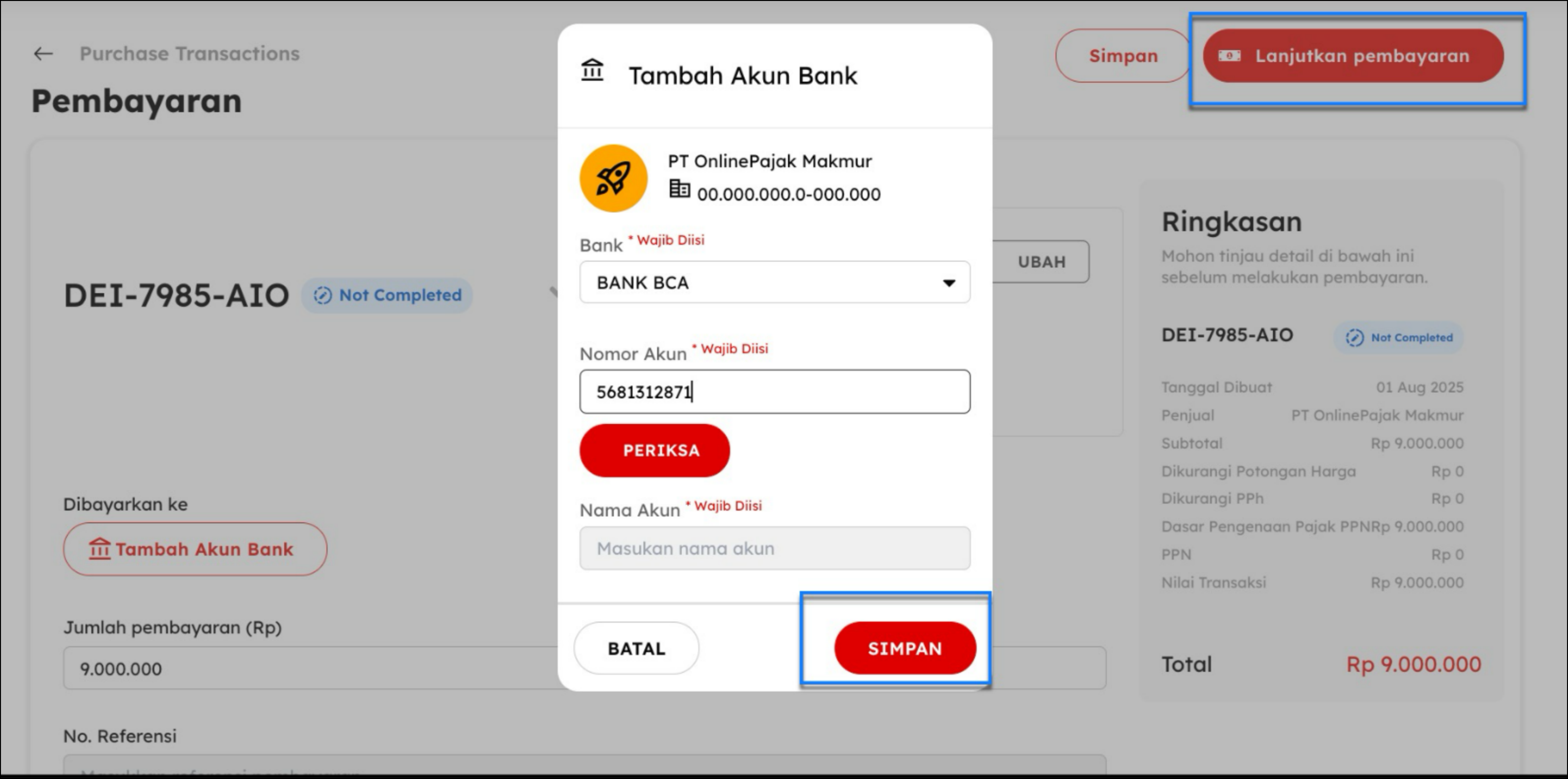 - Pilih Bank yang digunakan oleh Vendor dan lengkapi nomor rekening, setelah itu klik tombol Periksa, jika Nama yang muncul sesuai, klik tombol Simpan. klik “Lanjutkan Pembayaran” untuk diarahkan ke halaman metode pembayaran.