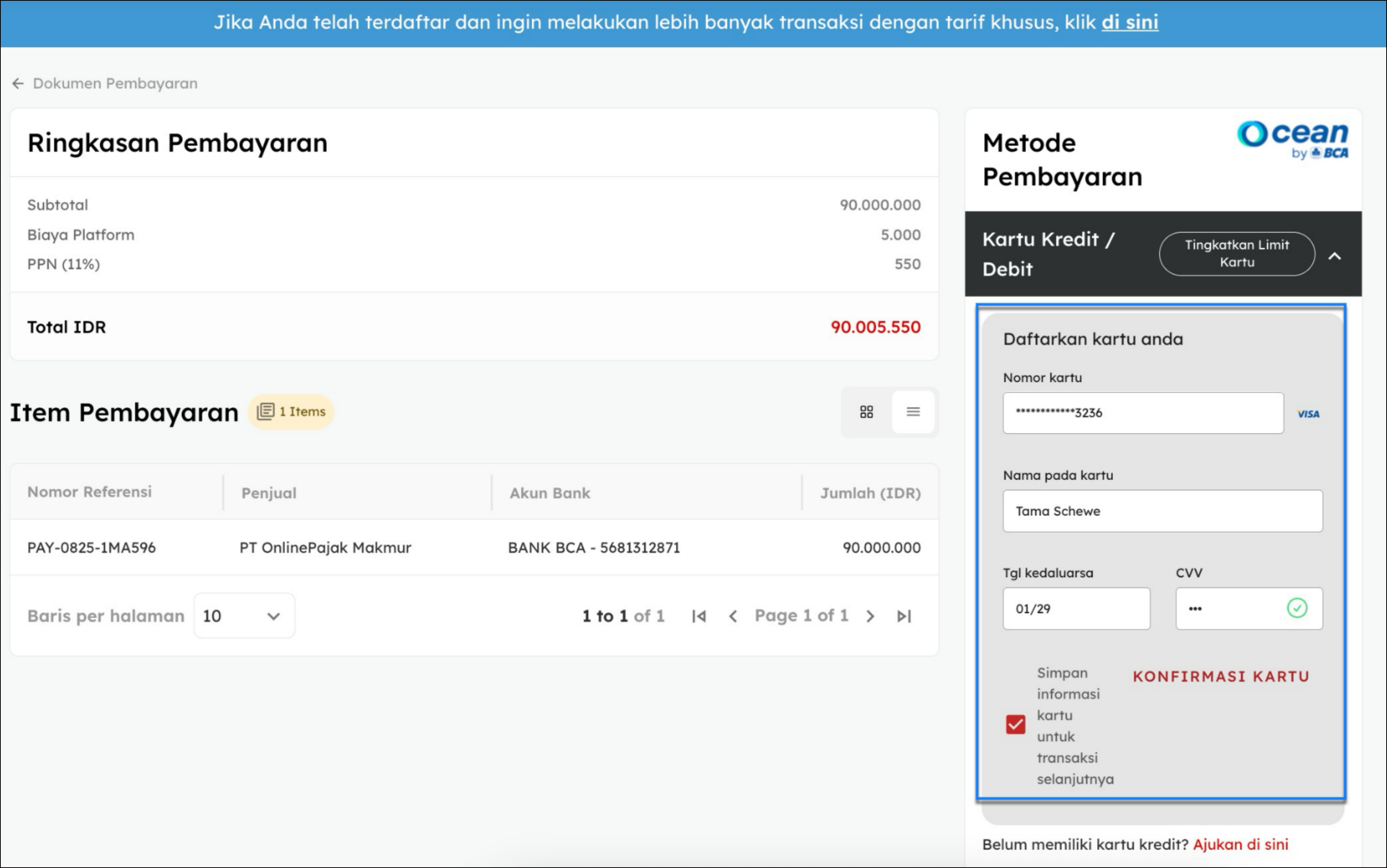 - Di halaman metode pembayaran, pilih “Kartu Kredit / Debit”, lengkapi data tersebut, kemudian klik Konfirmasi Kartu.