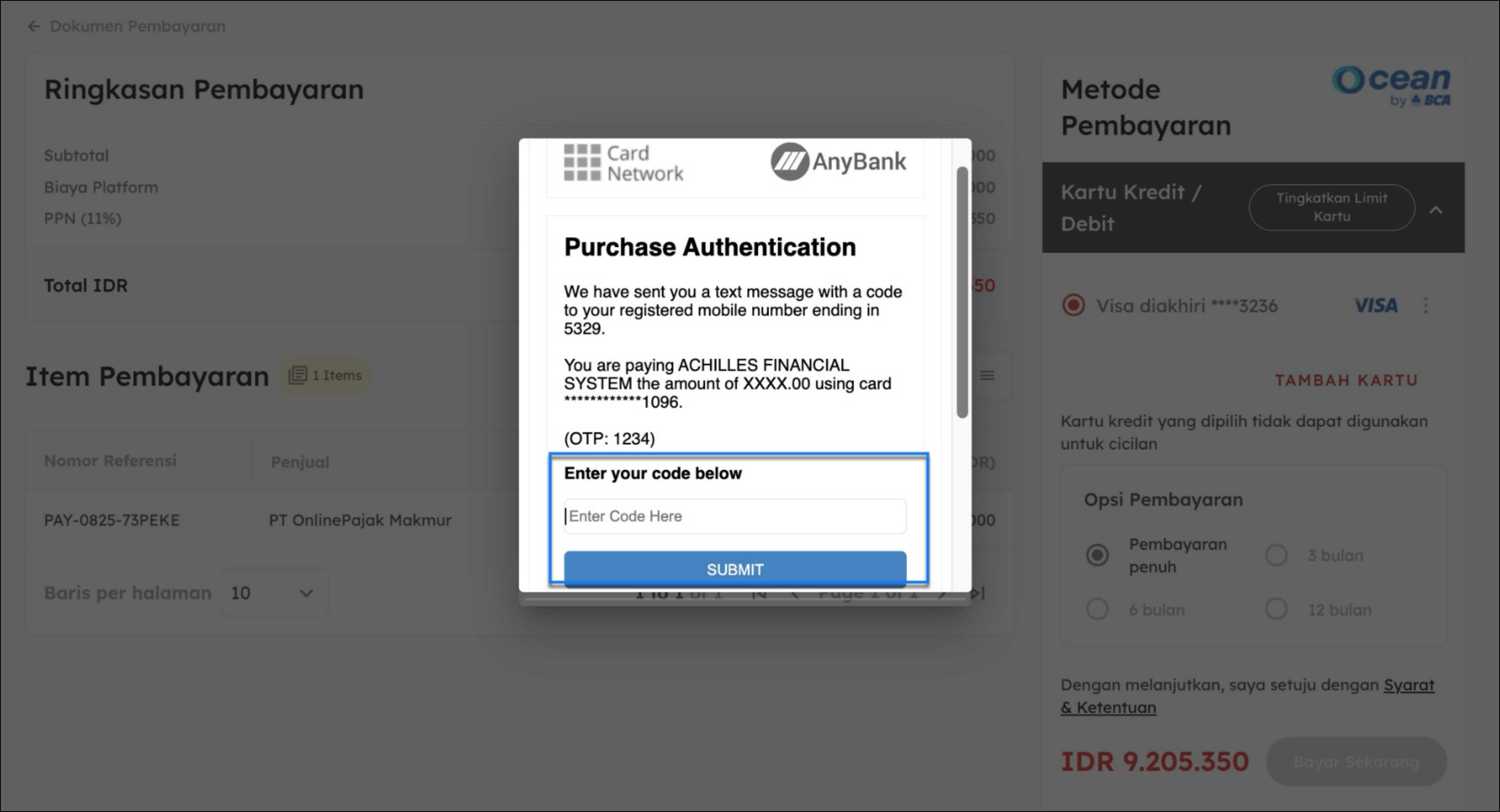 - Anda akan diarahkan halaman OTP untuk verifikasi pembayaran, lengkapi OTP yang Anda terima, kemudian klik Submit.